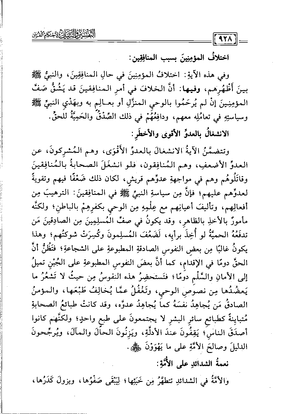 وتتضمَّنُ الآيةُ الانشغالَ بالعدوِّ الأَقْوَى، وهم المُشرِكونَ، عن العدوِّ الأضعف، وهم المُنافِقون، فلو انشغل الصحابة بالمُنافِقينَ وقاتَلُوهُم وهم في مواجهةِ عدوِّهم قريشٍ، لكان ذلك ضَعْفًا فيهم وتقويةً لعدوِّهم عليهم؛ فإنَّ مِن سياسةِ النبيِّ - صلى الله عليه وسلم - في المنافِقينَ: الترهيبَ مِن أفعالِهم، وتأليفَ أعيانِهم مع عِلْمِهِ مِن الوحيِ بكفرِهِمْ بالباطنِ؛ ولكنَّه مأمورٌ بالأخذِ بالظاهر، وقد يكونُ في صفِّ الَمُسلِمِينَ مِن الصادِقينَ مَن تدفَعُهُ الحميَّةُ لو أُخِذَ برأيِه، لَضَعُفَ المُسلِمونَ وكُسِرَتْ شوكتُهم؛ وهذا يكونُ غالبًا مِن بعضِ النفوسِ الصادقةِ المطبوعةِ على الشجاعةِ؛ فتَظُنُّ أنَّ الحقَّ دومًا في الإقدام، كما أنَّ بعضَ النفوسِ المطبوعةِ على الجُبْنِ تميلُ إلى الأمانِ والسَّلْمِ دومًا؛ فتَستحضِرُ هذه النفوسُ مِن حيثُ لا تَشعُرُ ما يَعضُدُها مِن نصوصِ الوحي، وتَغْفُلُ عمَّا يُخالِفُ طَبْعَها، والمؤمنُ الصادقُ مَن يُجاهِدُ نفسَهُ كما يُجاهِدُ عدوَّه، وقد كانتْ طبائعُ الصحابةِ مُتبايِنةً كطبائعِ سائرِ البشرِ لا يجتمعونَ على طبعٍ واحدٍ؛ ولكنَّهم كانوا أصدَقَ الناسِ؛ يَقِفُونَ عندَ الأدلَّة، وَيزِنُونَ الحالَ والمآلَ، ويُرجِّحونَ الدليلَ وصالحَ الأمَّةِ على ما يَهْوَوْنَ - رضي الله عنهم -.