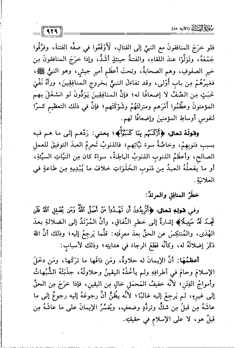 وفي قولِهِ تعالى: {أَتُرِيدُونَ أَنْ تَهْدُوا مَنْ أَضَلَّ اللَّهُ وَمَنْ يُضْلِلِ اللَّهُ فَلَنْ تَجِدَ لَهُ سَبِيلًا} إشارةٌ إلى خطرِ النِّفاقِ، وأنَّ المُرْتَدَّ إلى الضلالةِ بعدَ الهُدَى، والمُنتكِسَ عن الحقِّ بعدَ معرِفَتِه: قلَّما يَرجِعُ إليه؛ وذلك أنَّ اللهَ ذكَرَ إضلالَهُ له، وكأنَّه قطَعَ الرجاءَ في هدايتِه؛ وذلك لأسبابٍ: