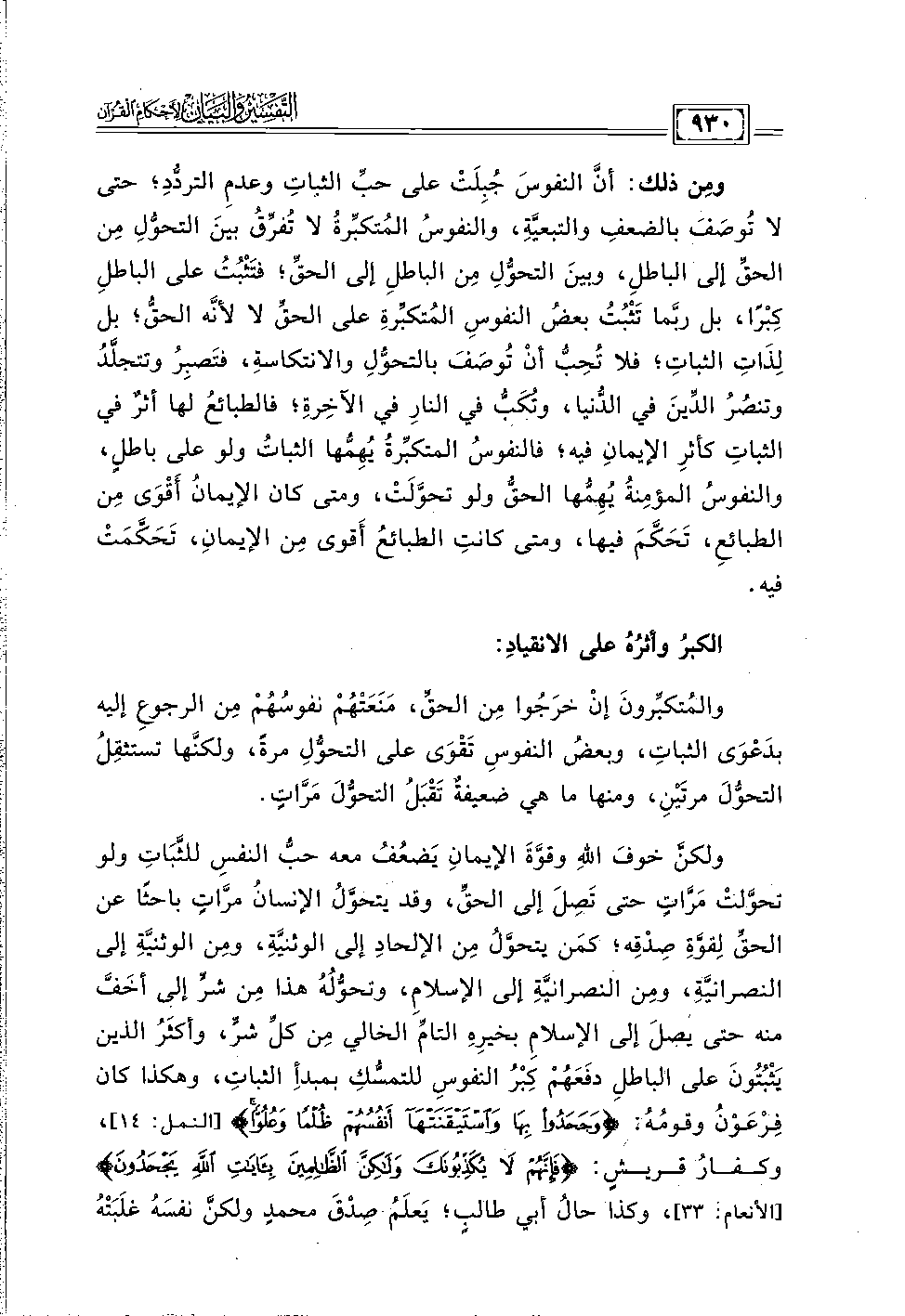 ولكنَّ خوفَ اللهِ وقوَّةَ الإيمانِ يَضعُفُ معه حبُّ النفسِ للثَّبَاتِ ولو تحوَّلتْ مَرَّاتٍ حتى تَصِلَ إلى الحقِّ، وقد يتحوَّلُ الإنسانُ مرَّاتٍ باحثًا عن الحقِّ لِقوَّةِ صِدْقِه؛ كمَن يتحوَّلُ مِن الإلحادِ إلى الوثنيَّة، ومِن الوثنيَّةِ إلى النصرانيَّةِ، ومِن النصرانيَّةِ إلى الإسلام، وتحوُّلُهُ هذا مِن شرٍّ إلى أخَفَّ منه حتى يصلَ إلى الإسلامِ بخيرِهِ التامِّ الخالي مِن كلِّ شرٍّ، وأكثَرُ الذين يَثْبُتُونَ على الباطلِ دفَعَهُمْ كِبْرُ النفوسِ للتمسُّكِ بمبدأِ الثبات، وهكذا كان فِرْعَوْنُ وقومُهُ: {وَجَحَدُوا بِهَا وَاسْتَيْقَنَتْهَا أَنْفُسُهُمْ ظُلْمًا وَعُلُوًّا} [النمل: ١٤]، وكفارُ قريشٍ: {فَإِنَّهُمْ لَا يُكَذِّبُونَكَ وَلَكِنَّ الظَّالِمِينَ بِآيَاتِ اللَّهِ يَجْحَدُونَ} [الأنعام: ٣٣]، وكذا حالُ أبي طالبٍ؛ يَعلَمُ صِدْقَ محمدٍ ولكنَّ نفسَهُ غلَبَتْهُ