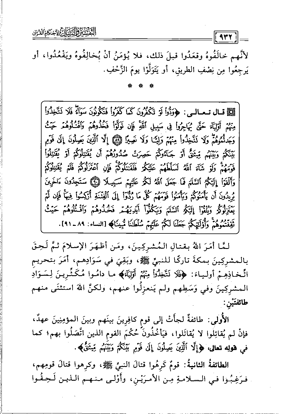 قال تعالى: {وَدُّوا لَوْ تَكْفُرُونَ كَمَا كَفَرُوا فَتَكُونُونَ سَوَاءً فَلَا تَتَّخِذُوا مِنْهُمْ أَوْلِيَاءَ حَتَّى يُهَاجِرُوا فِي سَبِيلِ اللَّهِ فَإِنْ تَوَلَّوْا فَخُذُوهُمْ وَاقْتُلُوهُمْ حَيْثُ وَجَدْتُمُوهُمْ وَلَا تَتَّخِذُوا مِنْهُمْ وَلِيًّا وَلَا نَصِيرًا (٨٩) إِلَّا الَّذِينَ يَصِلُونَ إِلَى قَوْمٍ بَيْنَكُمْ وَبَيْنَهُمْ مِيثَاقٌ أَوْ جَاءُوكُمْ حَصِرَتْ صُدُورُهُمْ أَنْ يُقَاتِلُوكُمْ أَوْ يُقَاتِلُوا قَوْمَهُمْ وَلَوْ شَاءَ اللَّهُ لَسَلَّطَهُمْ عَلَيْكُمْ فَلَقَاتَلُوكُمْ فَإِنِ اعْتَزَلُوكُمْ فَلَمْ يُقَاتِلُوكُمْ وَأَلْقَوْا إِلَيْكُمُ السَّلَمَ فَمَا جَعَلَ اللَّهُ لَكُمْ عَلَيْهِمْ سَبِيلًا (٩٠) سَتَجِدُونَ آخَرِينَ يُرِيدُونَ أَنْ يَأْمَنُوكُمْ وَيَأْمَنُوا قَوْمَهُمْ كُلَّ مَا رُدُّوا إِلَى الْفِتْنَةِ أُرْكِسُوا فِيهَا فَإِنْ لَمْ يَعْتَزِلُوكُمْ وَيُلْقُوا إِلَيْكُمُ السَّلَمَ وَيَكُفُّوا أَيْدِيَهُمْ فَخُذُوهُمْ وَاقْتُلُوهُمْ حَيْثُ ثَقِفْتُمُوهُمْ وَأُولَئِكُمْ جَعَلْنَا لَكُمْ عَلَيْهِمْ سُلْطَانًا مُبِينًا} [النساء: ٨٩ - ٩١].