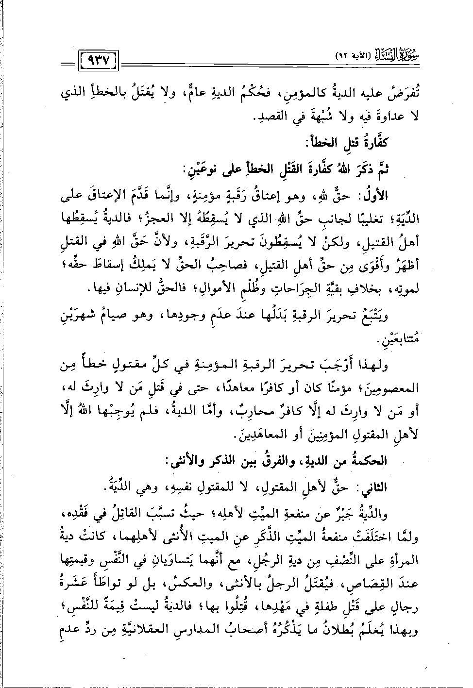 ولهذا أوْجَبَ تحريرَ الرفبةِ المؤمِنةِ في كلِّ مقتولٍ خطأً مِن المعصومِينَ؛ مؤمنًا كان أو كافرًا معاهدًا، حتى في قَتلِ مَن لا وارِثَ له، أو مَن لا وارِثَ له إلَّا كافرٌ محارِبٌ، وأمَّا الديةُ، فلم يُوجِبْها اللهُ إلَّا لأهلِ المقتولِ المؤمِنِينَ أو المعاهَدِينَ.