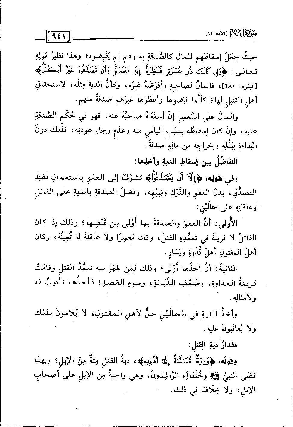 وقولُه: {وَدِيَةٌ مُسَلَّمَةٌ إِلَى أَهْلِهِ}، ديةُ القتلِ مِئةٌ مِنَ الإبلِ؛ وبهذا قَضَى النبيُّ - صلى الله عليه وسلم - وخُلَفاؤُه الرَّاشِدونَ، وهي واجبةٌ مِن الإبلِ على أصحابِ الإبلِ، ولا خِلَافَ في ذلك.
