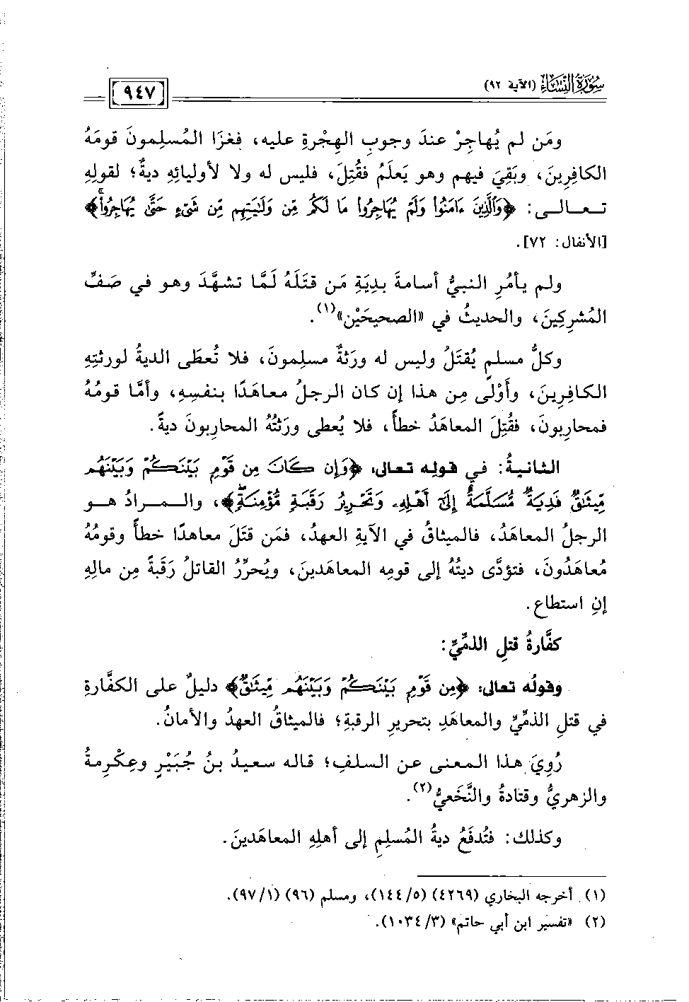 الثانيةُ: في قوله تعالى: {وَإِنْ كَانَ مِنْ قَوْمٍ بَيْنَكُمْ وَبَيْنَهُمْ مِيثَاقٌ فَدِيَةٌ مُسَلَّمَةٌ إِلَى أَهْلِهِ وَتَحْرِيرُ رَقَبَةٍ مُؤْمِنَةٍ}، والمرادُ هو الرجلُ المعاهَدُ، فالميثاقُ في الآيةِ العهدُ، فمَن قتَلَ معاهدًا خطأً وقومُهُ مُعاهَدُونَ، فتؤدَّى ديتُهُ إلى قومِه المعاهَدينَ، ويُحرِّرُ القاتلُ رَقَبةً مِن مالِهِ إنِ استطاع.