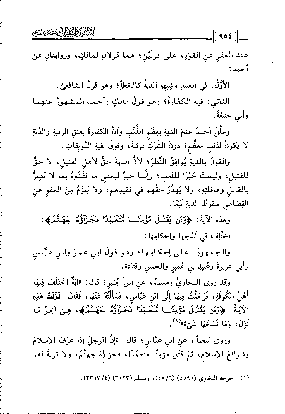 وقد روى البخاري ومسلم، عنِ ابنِ جُبيرٍ؛ قال: "آيَةٌ اختَلَفَ فِيهَا أَهْلُ الكُوفَة، فَرَحَلْتُ فِيهَا إِلَى ابْنِ عَبَّاسٍ، فَسَأَلْتُهُ عَنْهَا، فَقَالَ: نَزَلَتْ هَذِهِ الآيَةُ: {وَمَنْ يَقْتُلْ مُؤْمِنًا مُتَعَمِّدًا فَجَزَاؤُهُ جَهَنَّمُ}، هِيَ آخِرُ مَا نَزَلَ، وَمَا نَسَخَهَا شَيْءٌ" (١).