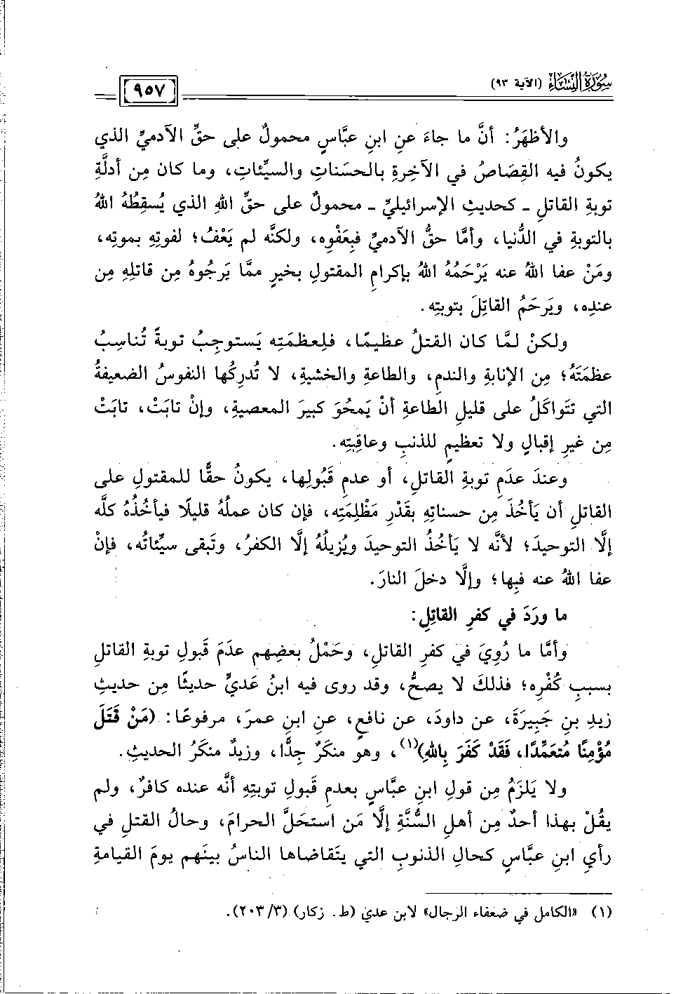 ولا يَلزَم مِن قولِ ابنِ عباسٍ بعدمِ قَبولِ توبتِهِ أنَّه عنده كافرٌ، ولم يقُلْ بهذا أحدٌ مِن أهلِ السنَّةِ إلَّا مَن استحَلَّ الحرامَ، وحالُ القتلِ في رأيِ ابنِ عبَّاسٍ كحالِ الذنوبِ التي يتَقاضاها الناسُ بينهم يومَ القيامةِ
