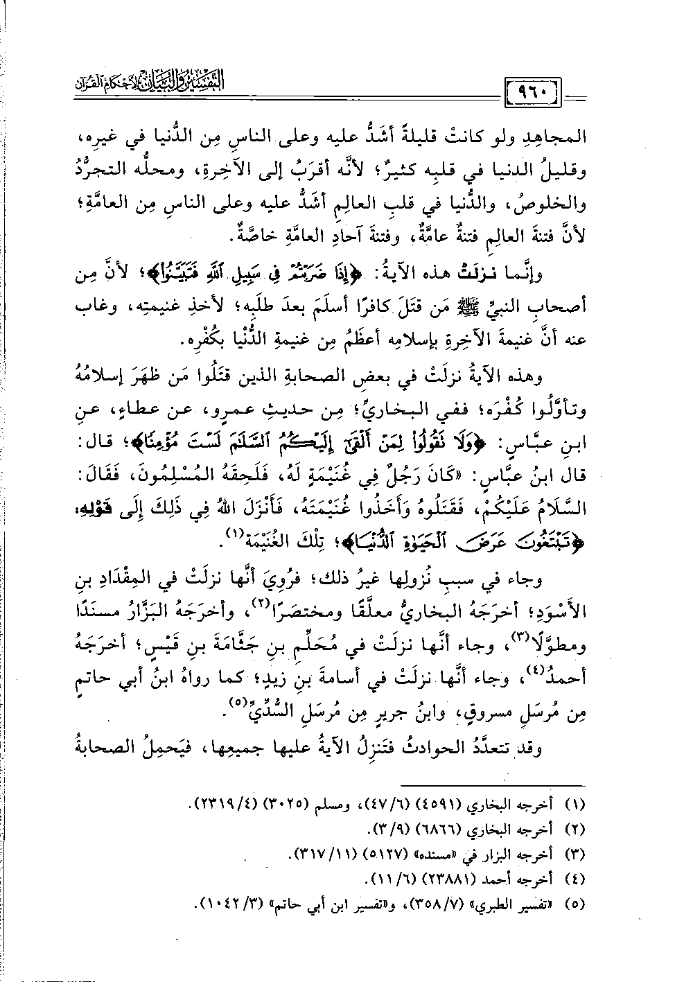 وهذه الآيةُ نزلَت في بعضِ الصحابةِ الذين قتَلُوا مَن ظهَرَ إسلامُهُ وتأوَّلُوا كُفْرَه؛ ففي البخاري؛ مِن حديثِ عمرٍو، عن عطاءٍ، عنِ ابنِ عبَّاسٍ: {وَلَا تَقُولُوا لِمَنْ أَلْقَى إِلَيْكُمُ السَّلَامَ لَسْتَ مُؤْمِنًا}؛ قال: قال ابن عباسٍ: "كَانَ رَجُلٌ فِي غُنَيمَةٍ لَهُ، فَلَحِقَهُ المسلِمُونَ، فَقَالَ: السَّلَامُ عَلَيكم، فَقتلوهُ وَأخَذُوا غُنَيمَتَهُ، فَأنْزَلَ اللهُ فِي ذَلِكَ إِلَى قولهِ: {تَبْتَغُونَ عَرَضَ الْحَيَاةِ الدُّنْيَا}؛ تِلكَ الغُنَيمَة (١).