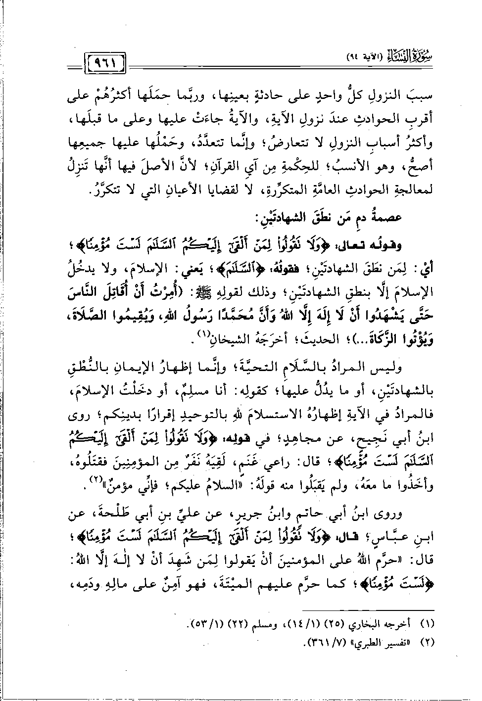 وليس المرادُ بالسَّلَامِ التحيةَ؛ وإنَّما إظهارُ الإيمانِ بالنطقِ بالشهادتَين، أو ما يدل عليها؛ كقولِه: أنا مسلِمٌ، أو دخَلتُ الإسلامَ، فالمرادُ في الآيةِ إظهارُهُ الاستسلامَ للهِ بالتوحيدِ إقرارًا بدينكم؛ روى ابنُ أبي نَجِيح، عن مجاهِدٍ؛ في قوله: {وَلَا تَقُولُوا لِمَنْ أَلْقَى إِلَيْكُمُ السَّلَامَ لَسْتَ مُؤْمِنًا}؛ قال: راعي غَنَمٍ، لَقِيَه نَفَرٌ مِن المؤمِنِينَ فقتلوهُ، وأخَذوا ما معَهُ، ولم يَقبَلُوا منه قولَه: "السلامُ عليكم؛ فإني مؤمنٌ" (٢).