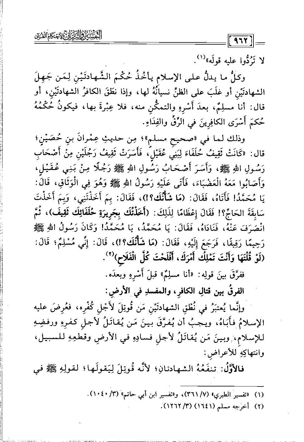 وإنما يُعتبَرُ في نُطْقِ الشهادتَينِ مَن قُوتِلَ لأَجلِ كُفرِه، فعرِضَ عليه الإسلام فأبَاهُ، ويجبُ أن يُفرَّقَ بين مَن يُقاتَلُ لأجلِ كفرِهِ ورفضِهِ للإسلام، وبينَ منَ يُقاتَلُ لأجلِ فساده في الأرضِ وقطعِهِ للسبيل، وانتهاكِهِ للأعراضِ: