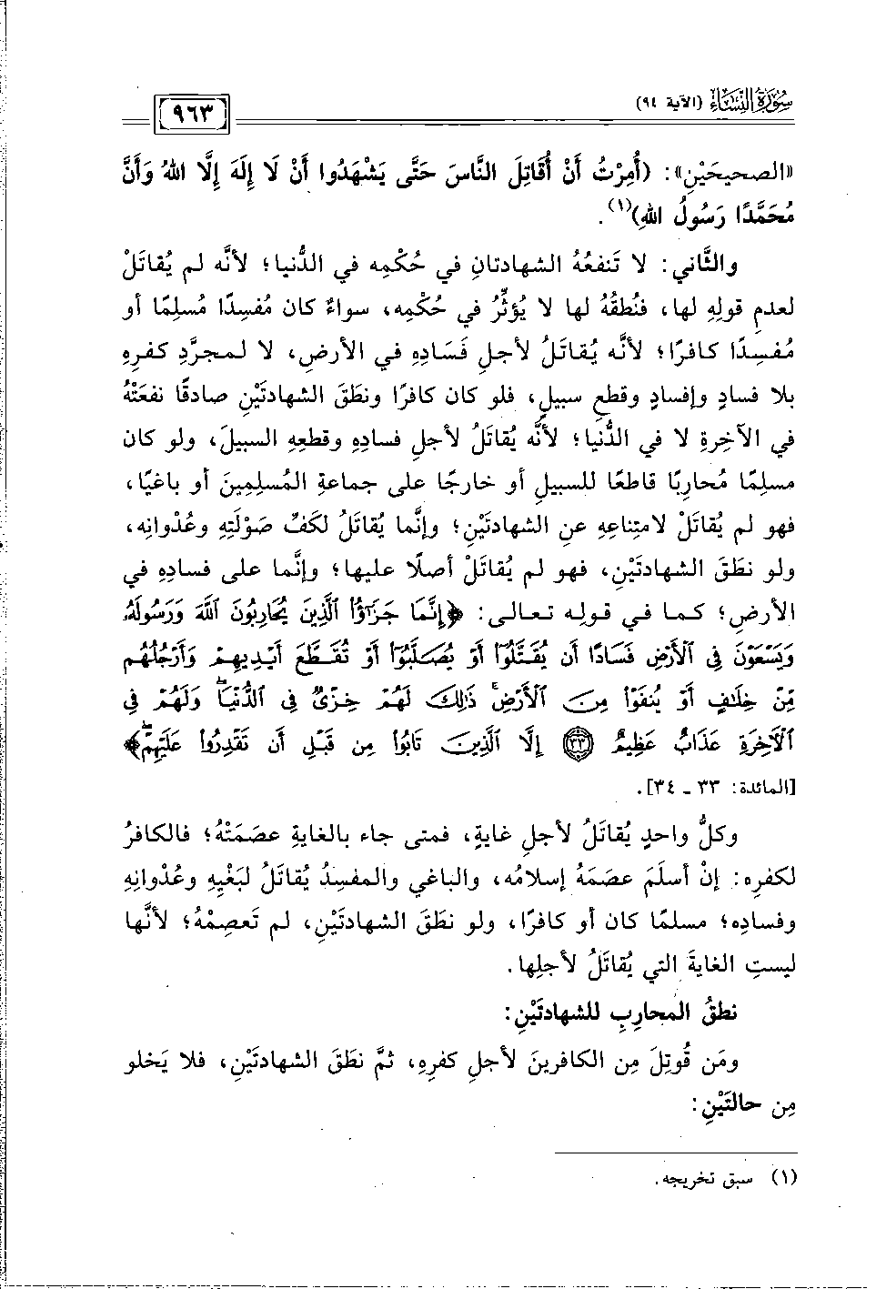 والثاني: لا تَنفعُه الشهادتانِ في حكْمِه في الدنيا؛ لأنَّه لم يُقاتَل لعدمِ قولِهِ لها، فنُطقُه لها لا يُؤثر في حُكمِه، سواءٌ كان مُفسِدًا مُسلِمًا أو مُفسِدًا كافرًا؛ لأنه يُقاتَلُ لأجلِ فَسَاد في الأرضِ, لا لمجرَّدِ كفرِهِ بلا فسادٍ وإفسادٍ وقطعِ سبيلٍ، فلو كان كافرًا ونطَقَ الشهادتَينِ صادقًا نفعَتْه في الآخِرةِ لا في الدنيا؛ لأنه يُقاتَلُ لأجلِ فسادِهِ وقطعِهِ السبيل، ولو كان مسلِمًا مُحارِبًا قاطعًا للسبيلِ أو خارجًا على جماعةِ المُسلِمِينَ أو باغيًا، فهو لم يُقاتَل لامتناعِهِ عنِ الشهادتَينِ؛ وإنما يُقاتَل لكَفِّ صَولَتِه وعُدْوانِه، ولو نطَقَ الشهادتين، فهو لم يُقاتَل أصلًا عليها؛ وإنما على فساده في الأرضِ؛ كما في قوله تعالى: {إِنَّمَا جَزَاءُ الَّذِينَ يُحَارِبُونَ اللَّهَ وَرَسُولَهُ وَيَسْعَوْنَ فِي الْأَرْضِ فَسَادًا أَنْ يُقَتَّلُوا أَوْ يُصَلَّبُوا أَوْ تُقَطَّعَ أَيْدِيهِمْ وَأَرْجُلُهُمْ مِنْ خِلَافٍ أَوْ يُنْفَوْا مِنَ الْأَرْضِ ذَلِكَ لَهُمْ خِزْيٌ فِي الدُّنْيَا وَلَهُمْ فِي الْآخِرَةِ عَذَابٌ عَظِيمٌ (٣٣) إِلَّا الَّذِينَ تَابُوا مِنْ قَبْلِ أَنْ تَقْدِرُوا عَلَيْهِمْ} [المائدة: ٣٣، ٣٤].