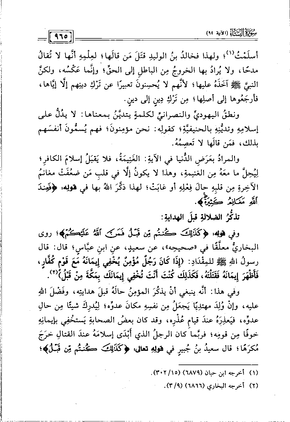 البخاري معلقًا في "صحيحِه"، عن سعيدٍ، عنِ ابنِ عبَّاسٍ؛ قال: قال رسول اللهِ - صلى الله عليه وسلم - للمِقدَادِ: (إِذَا كَانَ رَجُلٌ مُؤمِنٌ يُخفِي إِيمانَهُ مَعَ قَومٍ كفَّارٍ، فَأَظهَرَ إيمَانَهُ فَقَتَلْتَهُ، فكذَلِكَ كُنتَ أنتَ تُخفِي إِيمَانَكَ بِمَكَّةَ مِن قبل) (٢).