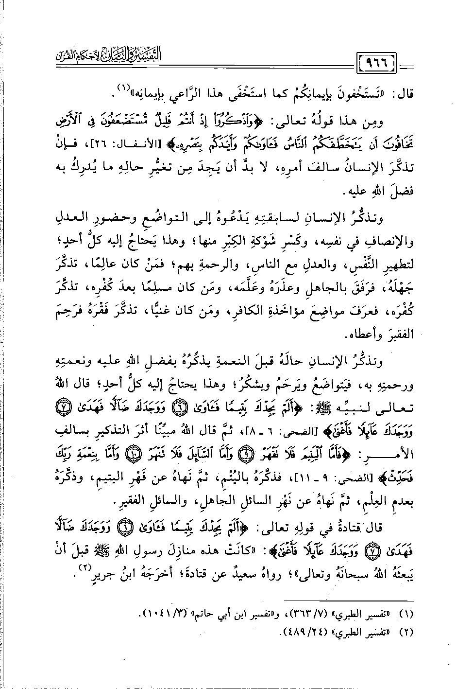 ومن هذا قولُهُ تعالى: {وَاذْكُرُوا إِذْ أَنْتُمْ قَلِيلٌ مُسْتَضْعَفُونَ فِي الْأَرْضِ تَخَافُونَ أَنْ يَتَخَطَّفَكُمُ النَّاسُ فَآوَاكُمْ وَأَيَّدَكُمْ بِنَصْرِهِ} [الأنفال: ٢٦]، فإن تذكَّرَ الإنسانُ سالفَ أمرِه، لا بدَّ أن يَجِدَ مِن تغيُّرِ حالِهِ ما يُدرِكُ به فضلَ اللهِ عليه.