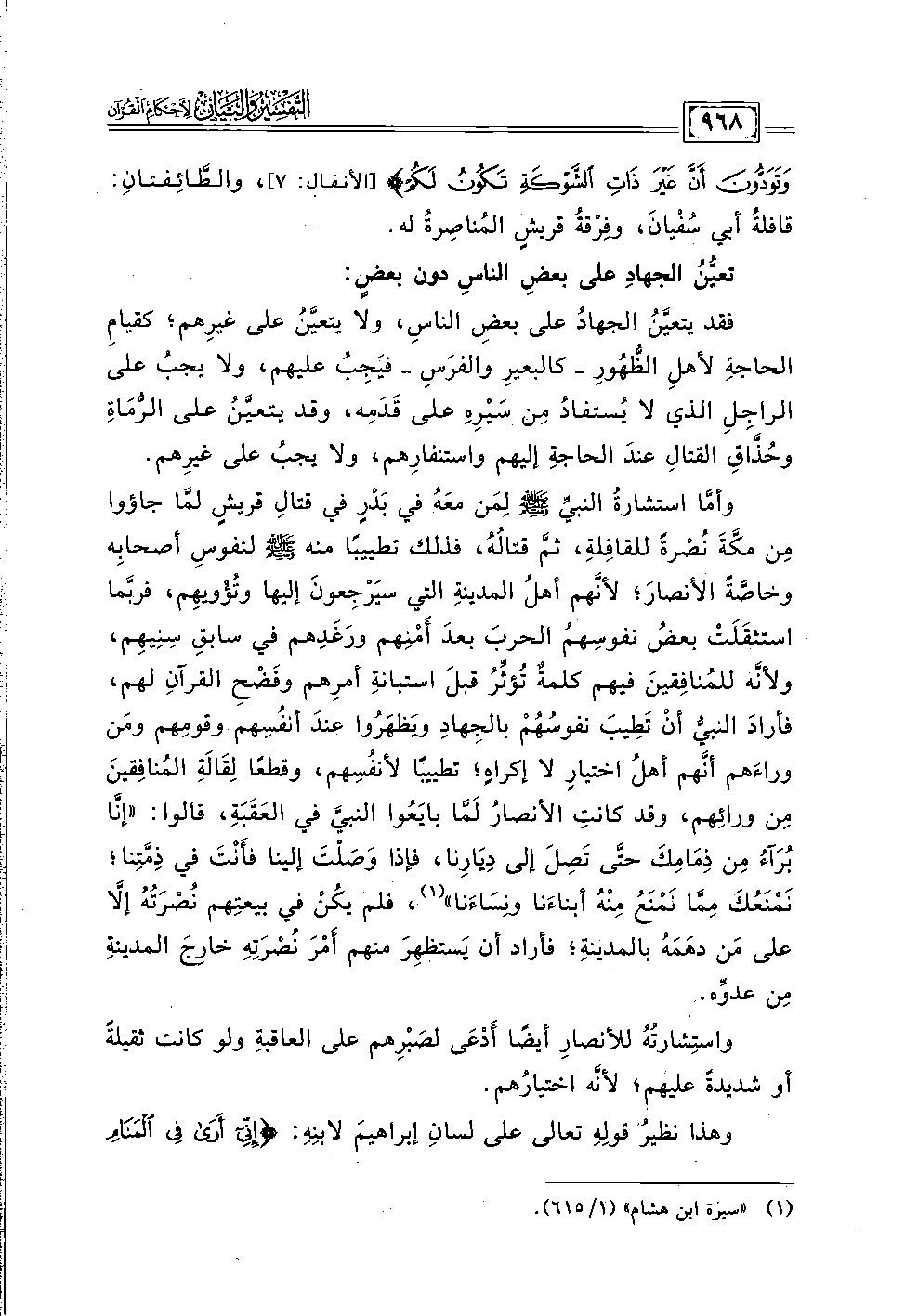 وأمَّا استشارةُ النبي - صلى الله عليه وسلم - لِمَن معَهُ في بَدرٍ في قتالِ قريشٍ لمَّا جاؤوا مِن مكَّةَ نُصْرةً للقافِلة، ثم قتالهُ، فذلك تطيبًا منه - صلى الله عليه وسلم - لنفوسِ أصحابِه وخاصَّةً الأنصارَ؛ لأنَّهم أهل المدينةِ التي سيَرجِعونَ إليها وتُؤويهِم، فربَّما استثقَلَتْ بعض نفوسِهمُ الحربَ بعدَ أمْنِهم ورَغَدِهم في سابقِ سِنِيهِم، ولأنَّه للمُنافِقينَ فيهم كلمةٌ تُؤثِّرُ قبلَ استبانة أمرِهم وفَضْحِ القرآنِ لهم، فأرادَ النبيُّ أن تَطيب نفوسهُم بالجِهادِ ويَظهَرُوا عندَ أنفُسِهم وقومِهم ومَن وراءَهم أنهم أهلُ اختيارٍ لا إكراه؛ تطييبًا لأنفُسِهم، وقطعًا لِقالَةِ المُنافِقينَ مِن ورائِهم، وقد كانتِ الأنصارُ لَمَّا بايَعُوا النبيَّ - صلى الله عليه وسلم - في العقَبَة، قالوا: "إنا بُرَآءُ مِن ذِمَامِكَ حتى تَصِلَ إلى دِيَارِنا، فإذا وَصلْتَ إلينا فأنتَ في ذِمَّتِنا؛ نَمْنَعُكَ مِمَّا نمنَع مِنهُ أبناءَنا ونسَاءَنا" (١)، فلم يكن في بيعتِهم نُصْرَتُهُ إلا على مَن دهَمَهُ بالمدينة، فأراد أن يَستظهِرَ منهم أمْرَ نصرَتِهِ خارج المدينةِ مِن عدوِّه.
