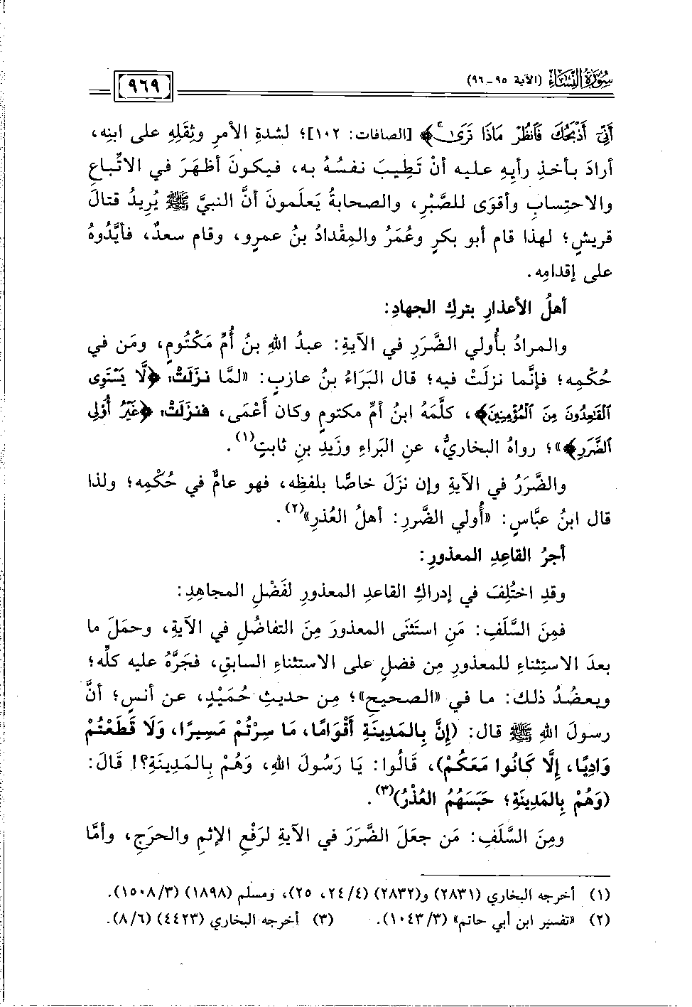 فمِنَ السَّلَفِ: مَنِ استَثنَى المعذورَ مِنَ التفاضُلِ في الآية، وحمَلَ ما بعدَ الاستثناءِ للمعذورِ مِن فضلٍ على الاستثناءِ السابق، فجَرَّهُ عليه كلِّه؛ ويعضُدُ ذلك: ما في "الصحيح"؛ مِن حديثِ حُمَيدٍ، عن أنسٍ؛ أن رسولَ اللهِ - صلى الله عليه وسلم - قال: (إِنَّ بِالمَدينَةِ أقوَامًا، مَا سِرْتُمْ مَسِيرًا، وَلَا قَطَعتُمْ وَادِيًا، إِلا كَانُوا مَعَكُم)، قَالُوا: يَا رَسُولَ الله، وَهُمْ بالمَدِينَةِ؟ ! قَالَ: (وَهُمْ بِالمَدِينةِ؛ حبسَهُمُ العُذر) (٣).