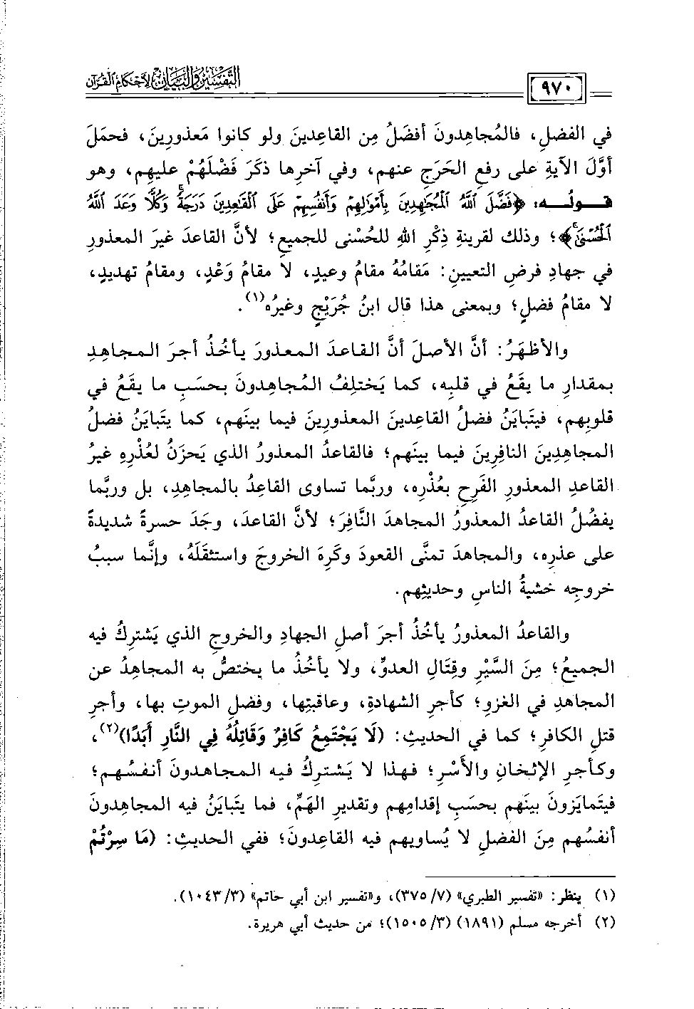 في الفضلِ، فالمُجاهِدونَ أفضَلُ مِن القاعِدينَ ولو كانوا مَعذورِينَ، فحمَلَ أوَّلَ الآيةِ على رفعِ الحَرَجِ عنهم، وفي آخرِها ذكَرَ فَضلَهُم عليهِم، وهو قوله {فَضَّلَ اللَّهُ الْمُجَاهِدِينَ بِأَمْوَالِهِمْ وَأَنْفُسِهِمْ عَلَى الْقَاعِدِينَ دَرَجَةً وَكُلًّا وَعَدَ اللَّهُ الْحُسْنَى}؛ وذلك لقرينةِ ذِكرِ اللهِ للحُسنى للجميعِ؛ لأنَّ القاعدَ غيرَ المعذورِ في جهادِ فرضِ التعيينِ: مَقامهُ مقامُ وعيدٍ، لا مقامُ وَعْدٍ، ومقامُ تهديدٍ، لا مقام فضلٍ؛ وبمعنى هذا قال ابنُ جُرَيجٍ وغيرُه (١).