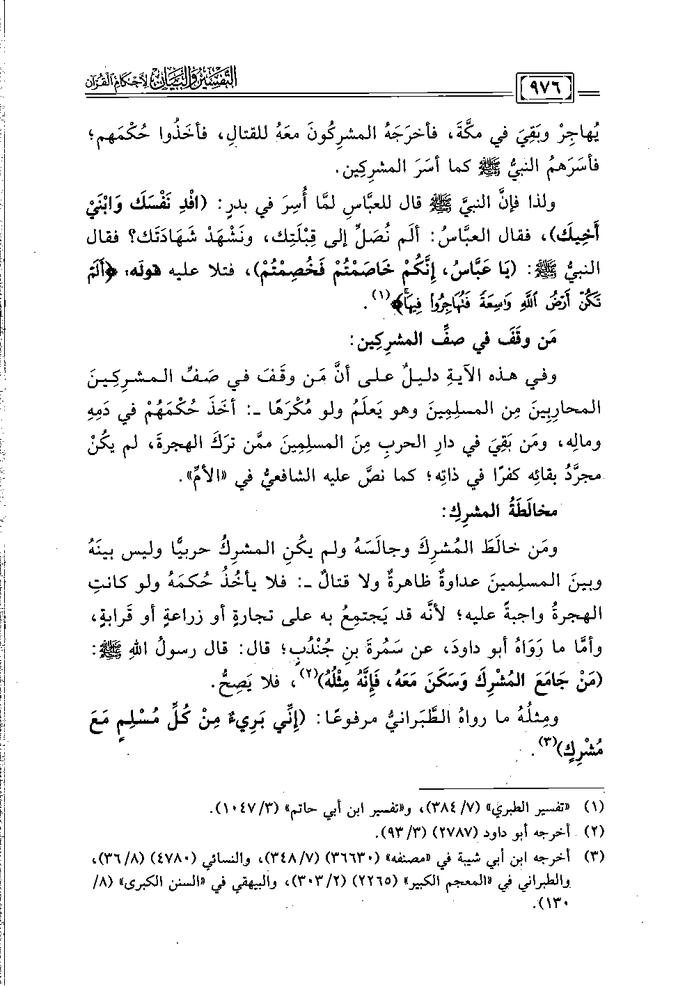 ولذا فإنَّ النبيَّ - صلى الله عليه وسلم - قال للعبَّاسِ لمَّا أُسِرَ في بدرٍ: (افْدِ نَفسَكَ وَابنَي أَخِيكَ)، فقال العبَّاسُ: ألَم نُصَلِّ إلى قِبلَتِك، ونَشهَد شهَادَتَك؟ فقال النبي - صلى الله عليه وسلم -: (يَا عَبَّاسُ، إِنكَمْ خَاصَمتُم فَخُصِمتُم)، فتلا عليه قوله: {أَلَمْ تَكُنْ أَرْضُ اللَّهِ وَاسِعَةً فَتُهَاجِرُوا فِيهَا} (١).