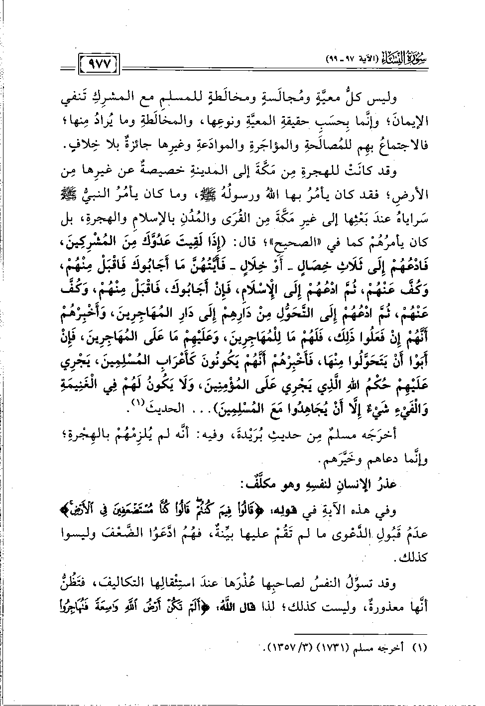 وقد تسوِّلُ النفسُ لصاحبِها عُذْرَها عندَ استِثْقالِها التكاليفَ، فتَظُنُّ أنَّها معذورةٌ، وليست كذلك؛ لذا قال اللهُ: {أَلَمْ تَكُنْ أَرْضُ اللَّهِ وَاسِعَةً فَتُهَاجِرُوا