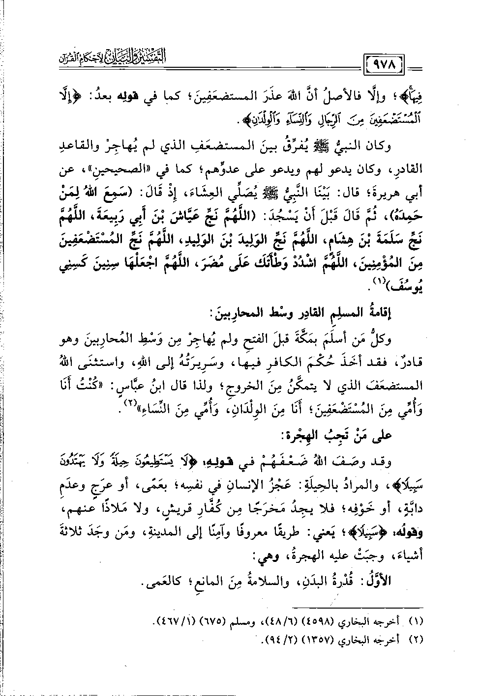 وكان النبيُّ - صلى الله عليه وسلم - يُفرِّقُ بينَ المسْتضَعَفِ الذي لم يُهاجِرْ والقاعدِ القادرِ، وكان يدعو لهم ويدعو عَلَى عدوِّهم؛ كما في "الصحيحينِ"، عن أبي هريرةَ؛ قال: بَيْنَا النَّبِيُّ - صلى الله عليه وسلم - يُصَلِّي العِشَاءَ، إِذْ قَالَ: (سَمِعَ اللهُ لِمَنْ حَمِدَهُ)، ثُمَّ قَالَ قَبْلَ أَنْ يَسْجُدَ: (اللَّهُمَّ نَجِّ عَيَّاشَ بْنَ أَبِي رَبِيعَةَ، اللَّهُمَّ نَجِّ سَلَمَةَ بْنَ هِشَامٍ، اللَّهُمَّ نَجِّ الوَليدَ بْنَ الوَلِيد، اللَّهُمَّ نَجِّ المُسْتَضْعَفِينَ مِنَ المُؤمِنِينَ، اللَّهُمَّ اشْدُدْ وَطْأَتَكَ عَلَى مُضَرَ، اللَّهُمَّ اجْعَلْهَا سِنِينَ كَسِنِي يُوسُفَ) (١).