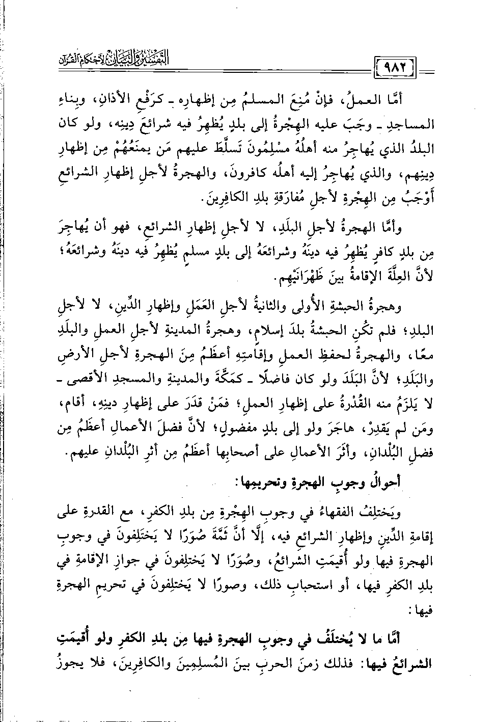 ويَختلِفُ الفقهاءُي وجوبِ الهجْرةِ مِن بلدِ الكفر، مع القدرةِ عَلَى إقامةِ الدِّينِ وإظهارِ الشرائعِ فيه، إلَّا أنَّ ثَمَّةَ صُوَرًا لا يَخْتَلِفونَ في وجوبِ الهجرةِ فبها ولو أُقيمَتِ الشرائعُ، وصُوَرًا لا يَختلِفونَ في جوازِ الإقامةِ في بلدِ الكفرِ فيها، أو استحبابِ ذلك، وصورًا لا يَختلِفونَ في تحريمِ الهجرةِ فيها: