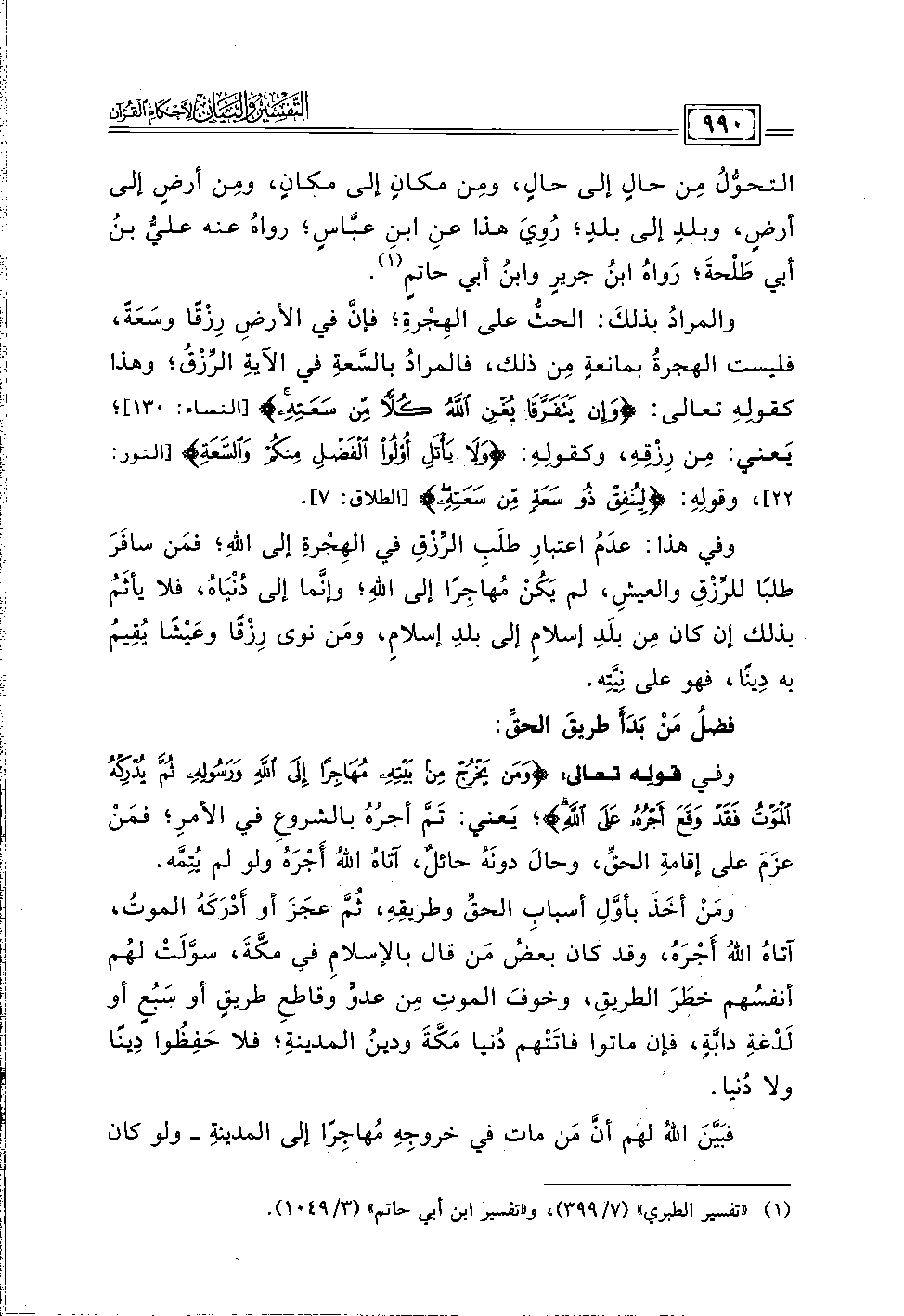 ومَن أخَذَ بأَوَّلِ أسبابِ الحقِّ وطريقِه، ثُمَّ عجَزَ أو أدْرَكَهُ الموتُ، آتاهُ اللهُ أَجْرَهُ، وقد كان بعضُ مَن قال بالإسلامِ في مكَّةَ، سوَّلَت لهُم أنفسُهم خطَرَ الطريقِ، وخوفَ الموتِ مِن عدوٍّ وقاطعِ طريقٍ أو سَبْعٍ أو لَدْغةِ دابَّةٍ، فإن ماتوا فاتَتْهم دُنيا مَكَّةَ ودينُ المدينةِ؛ فلا حَفِظُوا دِينًا ولا دُنيا.
