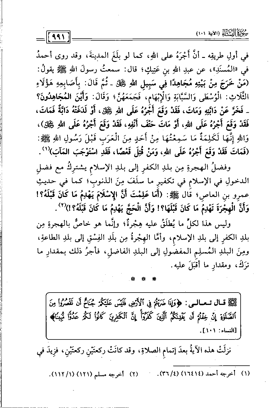 * قال تعالى: {وَإِذَا ضَرَبْتُمْ فِي الْأَرْضِ فَلَيْسَ عَلَيْكُمْ جُنَاحٌ أَنْ تَقْصُرُوا مِنَ الصَّلَاةِ إِنْ خِفْتُمْ أَنْ يَفْتِنَكُمُ الَّذِينَ كَفَرُوا إِنَّ الْكَافِرِينَ كَانُوا لَكُمْ عَدُوًّا مُبِينًا (١٠١)} [النساء: ١٠١].