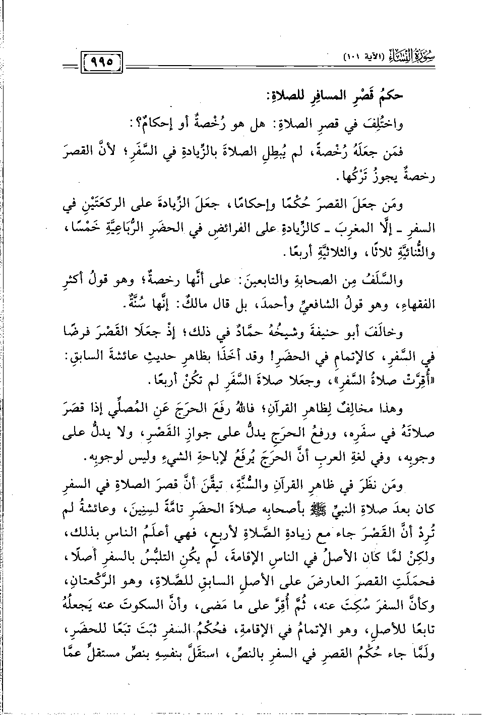 وهذا مخالِفٌ لِظاهرِ القرآنِ؛ فالله رفَعَ الحرَجَ عَنِ المُصلِّي إذا قصَرَ صلاتَهُ في سفَرِه، ورفعُ الحرَجِ يدلُّ عَلَى جوازِ القَصْر، ولا يدلُّ عَلَى وجوبِه، وفي لغةِ العربِ أنَّ الحرَجَ يُرفَعُ لإباحةِ الشيءِ وليس لوجوبِه.
