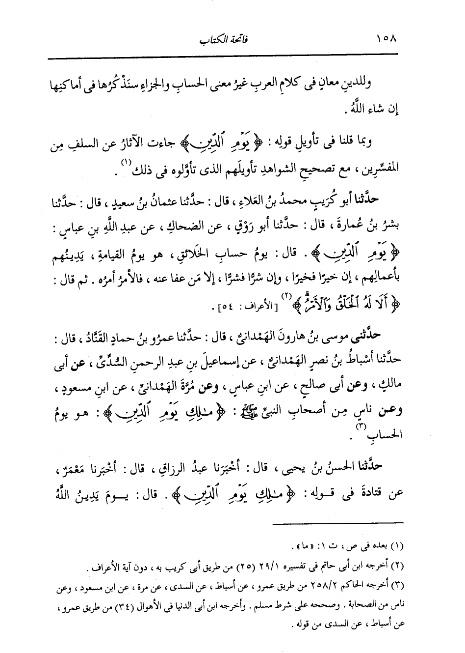 وَلِلدِّينِ مُعَانٍ فِي كَلَامِ الْعَرَبِ غَيْرَ مَعْنَى الْحِسَابِ وَالْجَزَاءِ سَنَذْكُرُهَا فِي أَمَاكِنِهَا إِنْ شَاءَ اللَّهُ. وَبِمَا قُلْنَا فِي تَأْوِيلِ قَوْلِهِ: {يَوْمِ الدِّينِ} [الفاتحة: 4] جَاءَتِ الْآثَارُ عَنِ السَّلَفِ مِنَ الْمُفَسِّرِينَ، مَعَ تَصْحِيحِ الشَّوَاهِدِ لِتَأْوِيلِهِمُ الَّذِي تَأَوَّلُوهُ فِي ذَلِكَ
