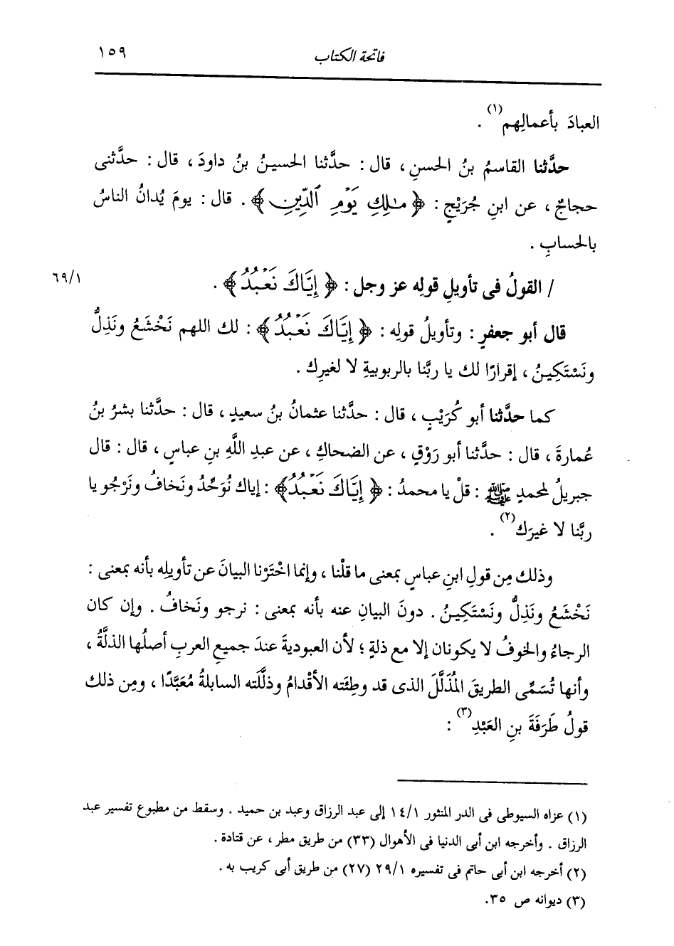 §الْقَوْلُ فِي تَأْوِيلِ قَوْلِهِ تَعَالَى: {إِيَّاكَ نَعْبُدُ وَإِيَّاكَ نَسْتَعِينُ} [الفاتحة: 5] قَالَ أَبُو جَعْفَرٍ: وَتَأْوِيلُ قَوْلِهِ: {إِيَّاكَ نَعْبُدُ} [الفاتحة: 5] لَكَ اللَّهُمَّ نَخْشَعُ وَنَذِلُّ وَنَسْتَكِينُ إِقْرَارًا لَكَ يَا رَبَّنَا بِالرُّبُوبِيَّةِ لَا لِغَيْرِكَ. كَمَا