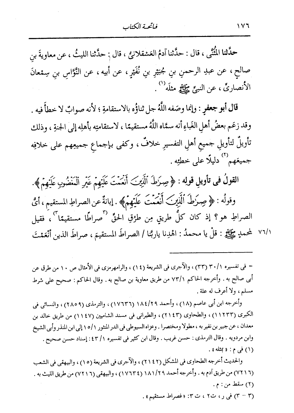 §وَقَوْلُهُ {صِرَاطَ الَّذِينَ أَنْعَمْتَ عَلَيْهِمْ} [الفاتحة: 7] إِبَانَةٌ عَنِ الصِّرَاطِ الْمُسْتَقِيمِ، أَيُّ الصِّرَاطِ هُوَ إِذْ كَانَ كُلُّ طَرِيقٍ مِنْ طُرُقِ الْحَقِّ صِرَاطًا مُسْتَقِيمًا؟ فَقِيلَ لِمُحَمَّدٍ صَلَّى اللهُ عَلَيْهِ وَسَلَّمَ: قُلْ يَا مُحَمَّدُ: اهْدِنَا يَا رَبَّنَا الصِّرَاطَ الْمُسْتَقِيمَ، صِرَاطَ الَّذِينَ أَنْعَمْتَ