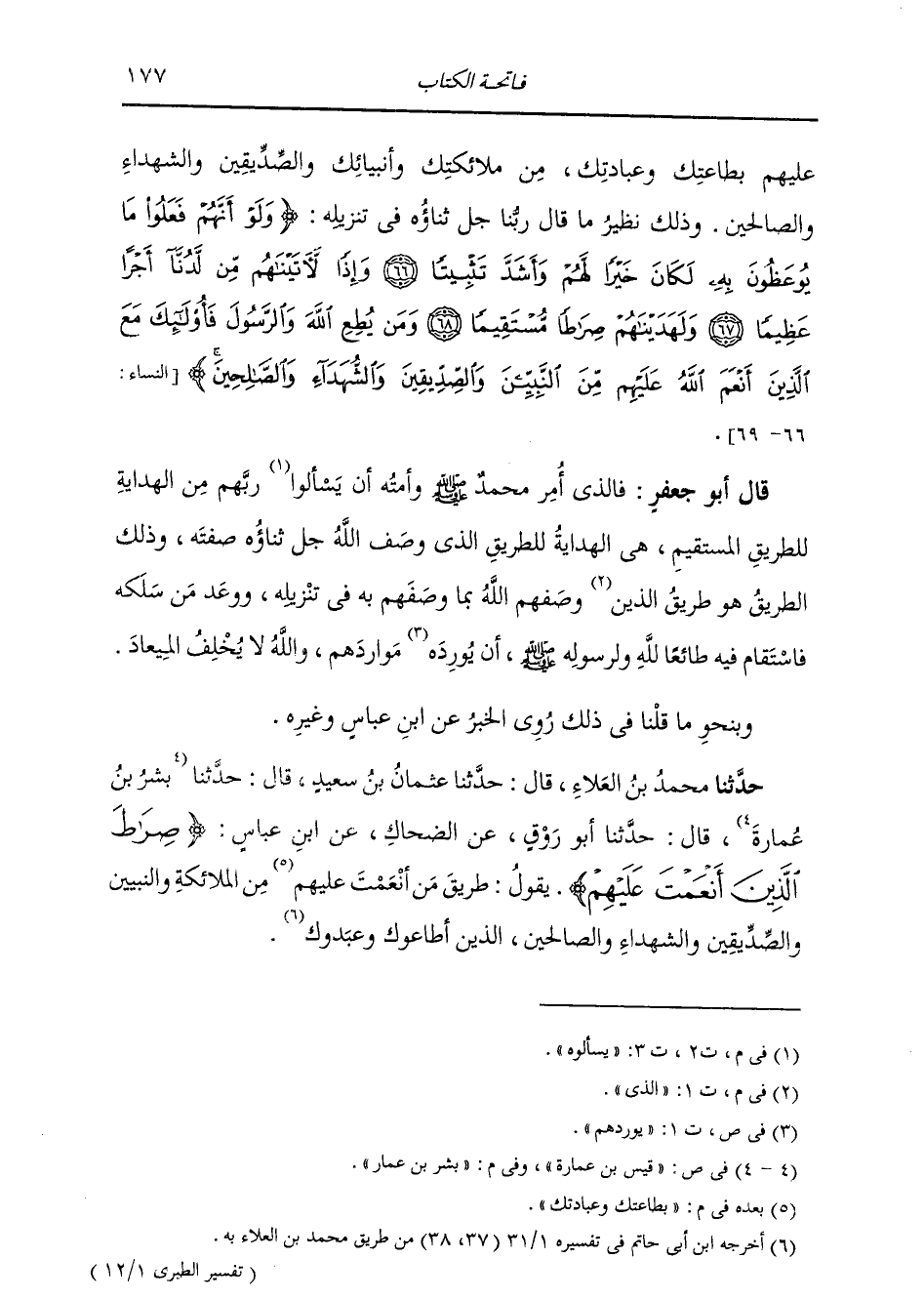 حَدَّثَنَا مُحَمَّدُ بْنُ الْعَلَاءِ، قَالَ: حَدَّثَنَا عُثْمَانُ بْنُ سَعِيدٍ، قَالَ: حَدَّثَنَا بِشْرُ بْنُ عَمَّارٍ، قَالَ: حَدَّثَنَا أَبُو رَوْقٍ، عَنِ الضَّحَّاكِ، عَنِ ابْنِ عَبَّاسٍ: " {صِرَاطَ الَّذِينَ أَنْعَمْتَ عَلَيْهِمْ} [الفاتحة: 7] يَقُولُ: §طَرِيقَ مَنْ أَنْعَمْتَ عَلَيْهِمْ بِطَاعَتِكَ وَعِبَادَتِكَ مِنَ الْمَلَائِكَةِ وَالنَّبِيِّينَ وَالصِّدِّيقِينَ وَالشُّهَدَاءِ وَالصَّالِحِينَ، الَّذِينَ أَطَاعُوكَ وَعَبَدُوكَ "