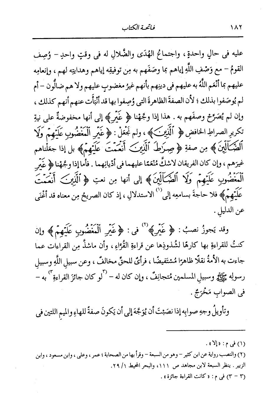 عَلَيْهِ فِي حَالٍ وَاحِدَةٍ وَاجْتِمَاعُ الْهُدَى وَالضَّلَالِ لَهُ فِي وَقْتٍ وَاحِدٍ، أَوُصِفَ الْقَوْمُ مَعَ وَصْفِ اللَّهِ إِيَّاهُمْ بِمَا وَصَفَهُمْ بِهِ مِنْ تَوْفِيقِهِ إِيَّاهُمْ وَهِدَايَتِهِ لَهُمْ وَإِنْعَامِهِ عَلَيْهِمْ بِمَا أَنْعَمَ اللَّهُ بِهِ عَلَيْهِمْ فِي دِينِهِمْ بِأَنَّهُمْ غَيْرُ مَغْضُوبٍ عَلَيْهِمْ وَلَا هُمْ ضَالُّونَ، أَمْ لَمْ يُوصَفُوا بِذَلِكَ؛ لِأَنَّ الصِّفَةَ الظَّاهِرَةَ الَّتِي وُصِفُوا بِهَا قَدْ أَنْبَأَتْ عَنْهُمْ أَنَّهُمْ كَذَلِكَ وَإِنْ لَمْ يُصَرِّحْ وَصْفُهُمْ بِهِ. هَذَا إِذَا وَجَّهْنَا غَيْرِ إِلَى أَنَّهَا مَخْفُوضَةٌ عَلَى نِيَّةِ تَكْرِيرِ الصِّرَاطِ الْخَافِضِ الَّذِينَ، وَلَمْ نَجْعَلْ {غَيْرِ الْمَغْضُوبِ عَلَيْهِمْ وَلَا الضَّالِّينَ} [الفاتحة: 7] مِنْ صِفَةِ {الَّذِينَ أَنْعَمْتَ عَلَيْهِمْ} [الفاتحة: 7] بَلْ إِذَا جَعَلْنَاهُمْ غَيْرَهُمْ؛ وَإِنْ كَانَ الْفَرِيقَانِ لَا شَكَّ مُنْعَمًا عَلَيْهِمَا فِي أَدْيَانِهِمْ. فَأَمَّا إِذَا وَجَّهْنَا: {غَيْرِ الْمَغْضُوبِ عَلَيْهِمْ وَلَا الضَّالِّينَ} [الفاتحة: 7] إِلَى أَنَّهَا مِنْ نِعْتِ {الَّذِينَ أَنْعَمْتَ عَلَيْهِمْ} [الفاتحة: 7] فَلَا حَاجَةَ بِسَامِعِهِ إِلَى الِاسْتِدْلَالِ، إِذْ كَانَ الصَّرِيحُ مِنْ مَعْنَاهُ قَدْ أَغْنَى عَنِ الدَّلِيلِ، وَقَدْ يَجُوزُ نَصْبُ غَيْرِ فِي {غَيْرِ الْمَغْضُوبِ عَلَيْهِمْ} [الفاتحة: 7] وَإِنْ كُنْتُ لِلْقِرَاءَةِ بِهَا كَارِهًا لِشُذُوذِهَا عَنْ قِرَاءَةِ الْقُرَّاءِ. وَإِنَّ مَا شَذَّ مِنَ الْقِرَاءَاتِ عَمَّا جَاءَتْ بِهِ الْأُمَّةُ نَقْلًا ظَاهِرًا مُسْتَفِيضًا، فَرَأْيٌ لِلْحَقِّ مُخَالِفٌ وَعَنْ سَبِيلِ اللَّهِ وَسَبِيلِ رَسُولِهِ صَلَّى اللهُ عَلَيْهِ وَسَلَّمَ وَسَبِيلِ الْمُسْلِمِينَ مُتَجَانِفٌ، وَإِنْ كَانَ لَهُ، لَوْ كَانَتِ الْقِرَاءَةُ جَائِزَةً بِهِ، فِي الصَّوَابِ مَخْرَجٌ. وَتَأْوِيلُ وَجْهِ صَوَابِهِ إِذَا نَصَبْتَ: أَنْ يُوَجَّهَ إِلَى أَنْ يَكُونَ صِفَةً لِلْهَاءِ وَالْمِيمِ اللَّتَيْنِ فِي