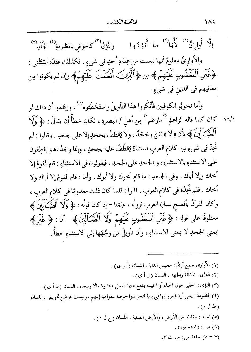وَالْأَوَارِيُّ مَعْلُومٌ أَنَّهَا لَيْسَتْ مِنْ عِدَادِ أَحَدٍ فِي شَيْءٍ. فَكَذَلِكَ عِنْدَهُ اسْتَثْنَى {غَيْرِ الْمَغْضُوبِ عَلَيْهِمْ} [الفاتحة: 7] مِنْ {الَّذِينَ أَنْعَمْتَ عَلَيْهِمْ} [الفاتحة: 7] وَإِنْ لَمْ يَكُونُوا مِنْ مَعَانِيهِمْ فِي الدِّينِ فِي شَيْءٍ. وَأَمَّا نَحْوِيُّو الْكُوفِيِّينَ فَأَنْكَرُوا هَذَا التَّأْوِيلَ وَاسْتَخْطَئُوهُ، وَزَعَمُوا أَنَّ ذَلِكَ لَوْ كَانَ كَمَا قَالَهُ الزَّاعِمُ مِنْ أَهْلِ الْبَصْرَةِ لَكَانَ خَطَأً أَنْ يُقَالَ: {وَلَا الضَّالِّينَ} [الفاتحة: 7] لِأَنَّ لَا نَفْيٌ وَجَحْدٌ، وَلَا يُعْطَفُ بِجَحْدٍ إِلَّا عَلَى جَحْدٍ؛ وَقَالُوا: لَمْ نَجِدْ فِي شَيْءٍ مِنْ كَلَامِ الْعَرَبِ اسْتِثْنَاءً يُعْطَفُ عَلَيْهِ بِجَحْدٍ، وَإِنَّمَا وَجَدْنَاهُمْ يَعْطِفُونَ عَلَى الِاسْتِثْنَاءِ بِالِاسْتِثْنَاءِ، وَبِالْجَحْدِ عَلَى الْجَحْدِ فَيَقُولُونَ فِي الِاسْتِثْنَاءِ: قَامَ الْقَوْمُ إِلَّا أَخَاكَ وَإِلَّا أَبَاكَ؛ وَفِي الْجَحْدِ: مَا قَامَ أَخُوكَ، وَلَا أَبُوكَ؛ وَأَمَا قَامَ الْقَوْمُ إِلَّا أَبَاكَ وَلَا أَخَاكَ، فَلَمْ نَجِدْهُ فِي كَلَامِ الْعَرَبِ؛ قَالُوا: فَلَمَّا كَانَ ذَلِكَ مَعْدُومًا فِي كَلَامِ الْعَرَبِ وَكَانَ الْقُرْآنُ بِأَفْصَحَ لِسَانِ الْعَرَبِ نُزُولُهُ، عَلِمْنَا إِذْ كَانَ قَوْلُهُ: {وَلَا الضَّالِّينَ} [الفاتحة: 7] مَعْطُوفًا عَلَى قَوْلِهِ: {غَيْرِ الْمَغْضُوبِ عَلَيْهِمْ} [الفاتحة: 7] أَنَّ غَيْرَ بِمَعْنَى الْجَحْدِ لَا بِمَعْنَى الِاسْتِثْنَاءِ، وَأَنَّ تَأْوِيلَ، مَنْ وَجَّهَهَا إِلَى الِاسْتِثْنَاءِ خَطَأٌ.