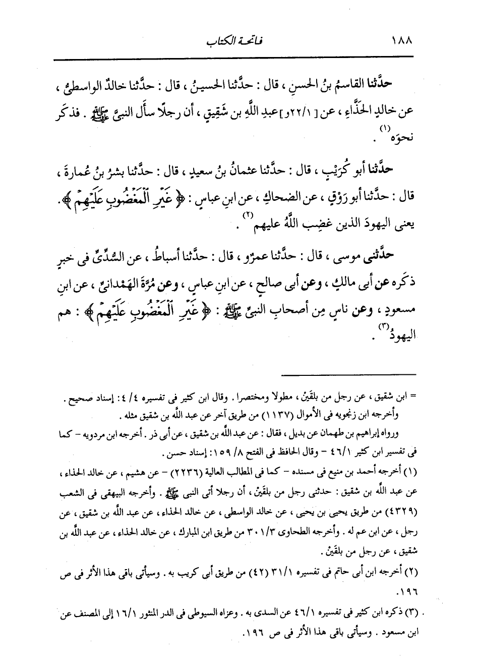 وَحَدَّثَنَا أَبُو كُرَيْبٍ، قَالَ: حَدَّثَنَا عُثْمَانُ بْنُ سَعِيدٍ، قَالَ: حَدَّثَنَا بِشْرُ بْنُ عَمَّارٍ، قَالَ: حَدَّثَنَا أَبُو رَوْقٍ، عَنِ الضَّحَّاكِ، عَنِ ابْنِ عَبَّاسٍ: " {§غَيْرِ الْمَغْضُوبِ عَلَيْهِمْ} [الفاتحة: 7] يَعْنِي الْيَهُودَ الَّذِينَ غَضِبَ اللَّهُ عَلَيْهِمْ "