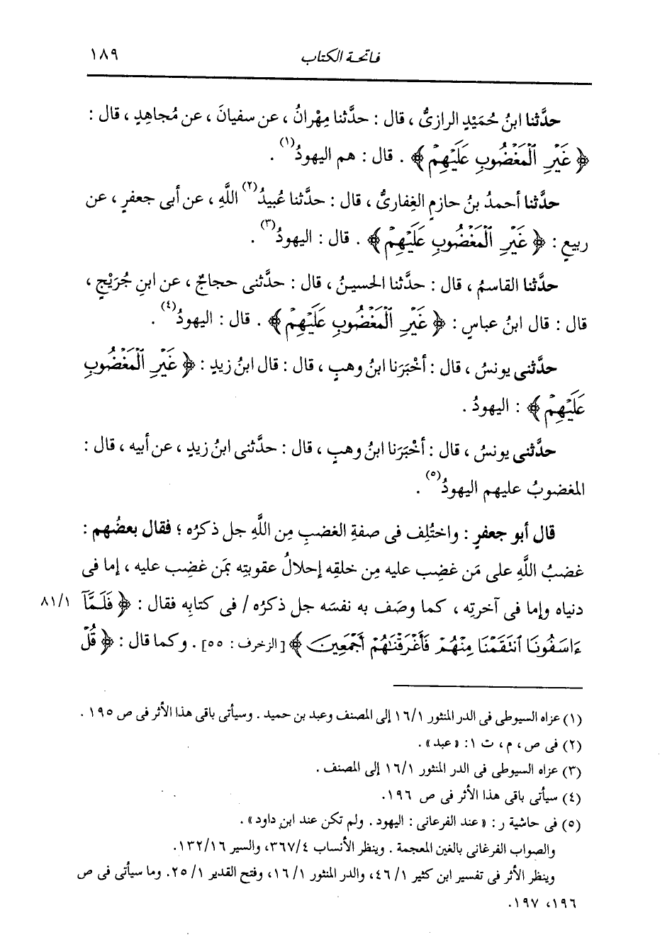 وَحَدَّثَنَا ابْنُ حُمَيْدٍ الرَّازِيُّ، قَالَ: حَدَّثَنَا مِهْرَانُ، عَنْ سُفْيَانَ، عَنْ مُجَاهِدٍ، قَالَ: " {§غَيْرِ الْمَغْضُوبِ عَلَيْهِمْ} [الفاتحة: 7] قَالَ: هُمُ الْيَهُودُ "
