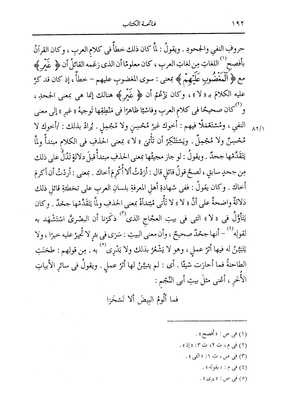 حُرُوفِ النَّفْيِ وَالْجُحُودِ؛ وَيَقُولُ: لَمَّا كَانَ ذَلِكَ خَطَأً فِي كَلَامِ الْعَرَبِ، وَكَانَ الْقُرْآنُ بِأَفْصَحِ اللُّغَاتِ مِنْ لُغَاتِ الْعَرَبِ. كَانَ مَعْلُومًا أَنَّ الَّذِيَ زَعَمَهُ الْقَائِلُ أَنَّ غَيْرَ مَعَ الْمَغْضُوبِ عَلَيْهِمْ بِمَعْنَى: سِوَى الْمَغْضُوبِ عَلَيْهِمْ خَطَأٌ، إِذْ كَانَ قَدْ كَرَّ عَلَيْهِ الْكَلَامَ بِلَا. وَكَانَ يَزْعُمُ أَنَّ غَيْرَ هُنَالِكَ إِنَّمَا هِيَ بِمَعْنَى الْجَحْدِ. إِذْ كَانَ صَحِيحًا فِي كَلَامِ الْعَرَبِ وَفَاشِيًا ظَاهِرًا فِي مَنْطِقِهَا تَوْجِيهُ غَيْرِ إِلَى مَعْنَى النَّفْيِ وَمُسْتَعْمَلًا فِيهِمْ: أَخُوكَ غَيْرُ مُحْسِنٍ وَلَا مُجْمِلٍ، يُرَادُ بِذَلِكَ أَخُوكَ لَا مُحْسِنٌ، وَلَا مُجْمِلٌ، وَيُسْتَنْكَرُ أَنْ تَأْتِيَ لَا بِمَعْنَى الْحَذْفِ فِي الْكَلَامِ مُبْتَدَأً وَلَمَّا يَتَقَدَّمْهَا جَحْدٌ، وَيَقُولُ: لَوْ جَازَ مَجِيئُهَا بِمَعْنَى الْحَذْفِ مُبْتَدَأً قَبْلَ دَلَالَةٍ تَدُلُّ، عَلَى ذَلِكَ مِنْ جَحْدٍ سَابِقٍ، لَصَحَّ قَوْلُ قَائِلٍ قَالَ: أَرَدْتُ أَنْ لَا أُكْرِمَ أَخَاكَ، بِمَعْنَى: أَرَدْتُ أَنْ أُكْرِمَ أَخَاكَ. وَكَانَ يَقُولُ: فَفِي شَهَادَةِ أَهْلِ الْمَعْرِفَةِ بِلِسَانِ الْعَرَبِ عَلَى تَخْطِئَةِ قَائِلِ ذَلِكَ دَلَالَةٌ وَاضِحَةٌ عَلَى أَنَّ لَا تَأْتِي مُبْتَدَأَةً بِمَعْنَى الْحَذْفِ، وَلَمَّا يَتَقَدَّمْهَا جَحْدٌ. وَكَانَ يَتَأَوَّلُهُ فِي لَا الَّتِي فِي بَيْتِ الْعَجَّاجِ الَّذِي ذَكَرْنَا أَنَّ الْبَصْرِيَّ اسْتَشْهَدَ بِهِ بِقَوْلِهِ إِنَّهَا جَحْدٌ صَحِيحٌ، وَأَنَّ مَعْنَى الْبَيْتِ: سَرَى فِي بِئْرٍ لَا تُحِيرُ عَلَيْهِ خَيْرًا، وَلَا يَتَبَيَّنُ لَهُ فِيهَا أَثَرُ عَمَلٍ، وَهُوَ لَا يَشْعُرُ بِذَلِكَ وَلَا يَدْرِي بِهِ. مِنْ قَوْلِهِمْ: طَحَنَتِ الطَّاحِنَةُ فَمَا أَحَارَتْ شَيْئًا؛ أَيْ لَمْ يَتَبَيَّنْ لَهَا أَثَرُ عَمَلٍ. وَيَقُولُ فِي سَائِرِ الْأَبْيَاتِ الْأُخَرِ، أَعْنِي مِثْلَ بَيْتِ أَبِي النَّجْمِ: