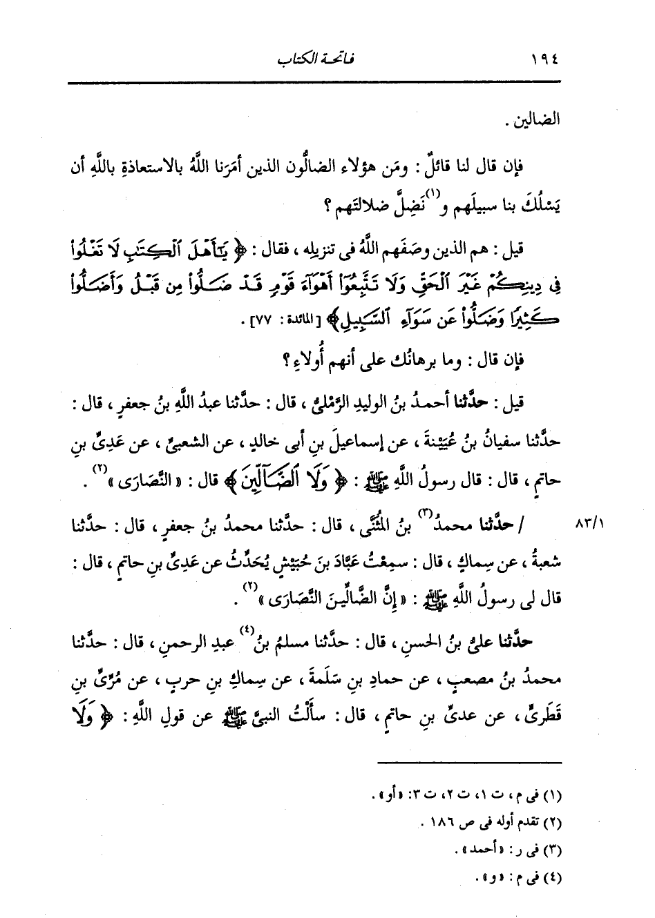حَدَّثَنَا مُحَمَّدُ بْنُ الْمُثَنَّى، أَنْبَأَنَا مُحَمَّدُ بْنُ جَعْفَرٍ، أَنْبَأَنَا شُعْبَةُ عَنْ سِمَاكٍ، قَالَ: سَمِعْتُ عَبَّادَ بْنَ حُبَيْشٍ يُحَدِّثُ عَنْ عَدِيِّ بْنِ حَاتِمٍ، قَالَ: قَالَ لِي رَسُولُ اللَّهِ صَلَّى اللهُ عَلَيْهِ وَسَلَّمَ: " إِنَّ §الضَّالِّينَ: النَّصَارَى "