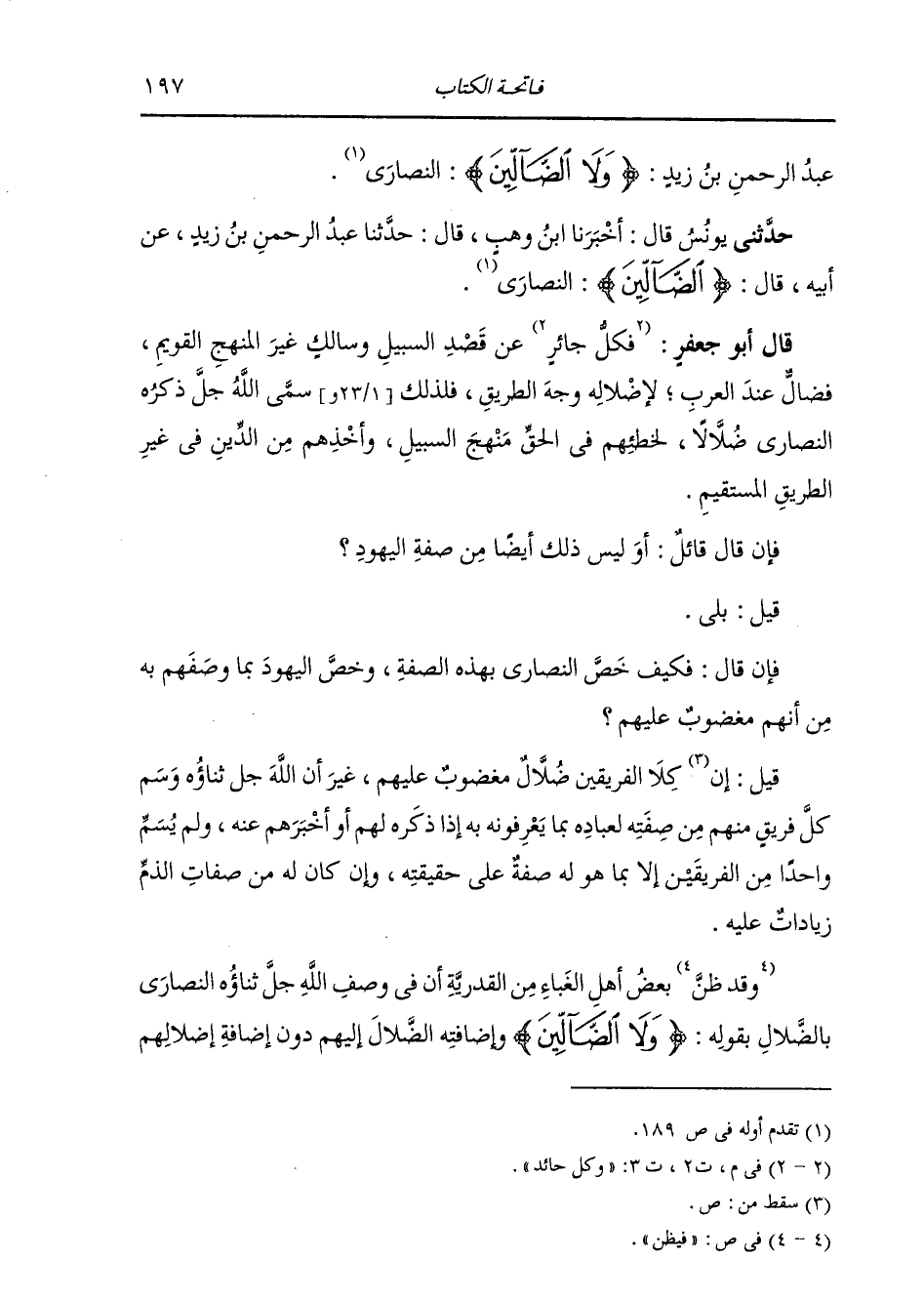 وَحَدَّثَنَا يُونُسُ، قَالَ: أَخْبَرَنَا ابْنُ وَهْبٍ، قَالَ: حَدَّثَنَا عَبْدُ الرَّحْمَنِ بْنُ زَيْدٍ، عَنْ أَبِيهِ، قَالَ: " {§وَلَا الضَّالِّينَ} [الفاتحة: 7] النَّصَارَى " قَالَ أَبُو جَعْفَرٍ: وَكُلُّ حَائِدٍ عَنْ قَصْدِ السَّبِيلِ وَسَالِكٍ غَيْرَ الْمَنْهَجِ الْقَوِيمِ فَضَالٌّ عِنْدَ الْعَرَبِ لِإِضْلَالِهِ وَجْهَ الطَّرِيقِ، فَلِذَلِكَ سَمَّى اللَّهُ جَلَّ ذِكْرُهُ النَّصَارَى ضُلَّالًا لِخَطَئِهِمْ فِي الْحَقِّ مَنْهَجَ السَّبِيلِ، وَأَخْذِهِمْ مِنَ الدِّينِ فِي غَيْرِ الطَّرِيقِ الْمُسْتَقِيمِ. فَإِنْ قَالَ قَائِلٌ: أَوَلَيْسَ ذَلِكَ أَيْضًا مِنْ صِفَةِ الْيَهُودِ؟ قِيلَ: بَلَى. فَإِنْ قَالَ: كَيْفَ خَصَّ النَّصَارَى بِهَذِهِ الصِّفَةِ، وَخَصَّ الْيَهُودَ بِمَا وَصَفَهُمْ بِهِ مِنْ أَنَّهُمْ مَغْضُوبٌ عَلَيْهِمْ؟ قِيلَ: إِنَّ كِلَا الْفَرِيقَيْنِ ضُلَّالٌ مَغْضُوبٌ عَلَيْهِمْ، غَيْرَ أَنَّ اللَّهَ جَلَّ ثَنَاؤُهُ وَسَمَ كُلَّ فَرِيقٍ مِنْهُمْ مِنْ صِفَتِهِ لِعِبَادِهِ بِمَا يَعْرِفُونَهُ بِهِ إِذَا ذَكَرَهُ لَهُمْ، أَوْ أَخْبَرَهُمْ عَنْهُ، وَلَمْ يُسَمِّ وَاحِدًا مِنَ الْفَرِيقَيْنِ إِلَّا بِمَا هُوَ لَهُ صِفَةٌ عَلَى حَقِيقَتِهِ، وَإِنْ كَانَ لَهُ مِنْ صِفَاتِ الذَّمِّ زِيَادَاتٌ عَلَيْهِ. وَقَدْ ظَنَّ بَعْضُ أَهْلِ الْغَبَاءِ مِنَ الْقَدَرِيَّةِ أَنَّ فِيَ وَصْفِ اللَّهِ جَلَّ ثَنَاؤُهُ النَّصَارَى بِالضُّلَالِ بِقَوْلِهِ: {وَلَا الضَّالِّينَ} [الفاتحة: 7] وَإِضَافَتِهِ الضُّلَّالَ إِلَيْهِمْ دُونَ إِضَافَةِ إِضْلَالِهِمْ