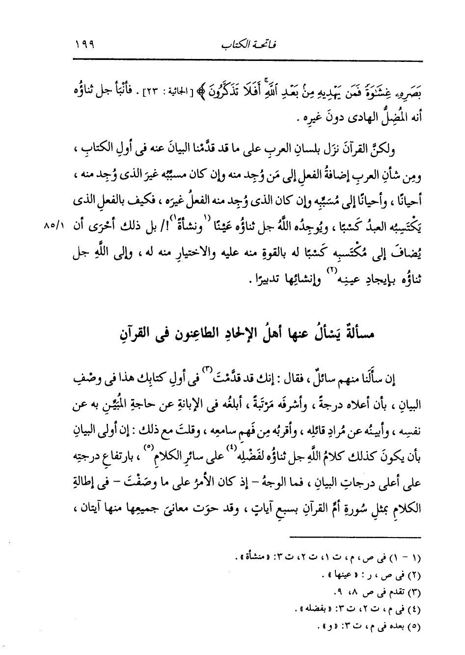 بَصَرِهِ غِشَاوَةً فَمَنْ يَهْدِيهِ مِنْ بَعْدِ اللَّهِ أَفَلَا تَذَكَّرُونَ} [الجاثية: 23] فَأَنْبَأَ جَلَّ ذِكْرُهُ أَنَّهُ الْمُضِلُّ الْهَادِي دُونَ غَيْرِهِ. وَلَكِنَّ الْقُرْآنَ نَزَلَ بِلِسَانِ الْعَرَبِ، عَلَى مَا قَدْ قَدَّمْنَا الْبَيَانَ عَنْهُ فِي أَوَّلِ الْكِتَابِ. وَمِنْ شَأْنِ الْعَرَبِ إِضَافَةُ الْفِعْلِ إِلَى مَنْ وُجِدَ مِنْهُ، وَإِنْ كَانَ مُسَبِّبُهُ غَيْرَ الَّذِي وُجِدَ مِنْهُ أَحْيَانًا، وَأَحْيَانًا إِلَى مُسَبِّبِهِ، وَإِنْ كَانَ الَّذِي وُجِدَ مِنْهُ الْفِعْلُ غَيْرَهُ. فَكَيْفَ بِالْفِعْلِ الَّذِي يَكْتَسِبُهُ الْعَبْدُ كَسْبًا وَيُوجِدُهُ اللَّهُ جَلَّ ثَنَاؤُهُ عَيْنًا مُنْشَأَةً؟ بَلْ ذَلِكَ أَحْرَى أَنْ يُضَافَ إِلَى مُكْتَسِبِهِ كَسْبًا لَهُ بِالْقُوَّةِ مِنْهُ عَلَيْهِ وَالِاخْتِيَارِ مِنْهُ لَهُ، وَإِلَى اللَّهِ جَلَّ ثَنَاؤُهُ بِإِيجَادِ عَيْنِهِ وَإِنْشَائِهَا تَدْبِيرًا. مَسْأَلَةٌ يَسْأَلُ عَنْهَا أَهْلُ الْإِلْحَادِ الطَّاعِنُونَ فِي الْقُرْآنِإِنْ سَأَلَنَا مِنْهُمْ سَائِلٌ فَقَالَ: إِنَّكَ قَدْ قَدَّمْتَ فِي أَوَّلِ كِتَابِكَ هَذَا فِي وَصْفِ الْبَيَانِ بِأَنَّ أَعْلَاهُ دَرَجَةً وَأَشْرَفَهُ مَرْتَبَةً، أَبْلَغُهُ فِي الْإِبَانَةِ عَنْ حَاجَةِ الْمُبِينِ بِهِ عَنْ نَفْسِهِ وَأَبْيَنُهُ عَنْ مُرَادِ قَائِلِهِ وَأَقْرَبُهُ مِنْ فَهْمِ سَامِعِهِ، وَقُلْتَ مَعَ ذَلِكَ إِنَّ أَوْلَى الْبَيَانِ بِأَنْ يَكُونَ كَذَلِكَ كَلَامُ اللَّهِ جَلَّ ثَنَاؤُهُ بِفَضْلِهِ عَلَى سَائِرِ الْكَلَامِ وَبِارْتِفَاعِ دَرَجَتِهِ عَلَى أَعْلَى دَرَجَاتِ الْبَيَانِ. فَمَا الْوَجْهُ إِذْ كَانَ الْأَمْرُ عَلَى مَا وَصَفْتَ فِي إِطَالَةِ الْكَلَامِ بِمِثْلِ سُورَةِ أُمِّ الْقُرْآنِ بِسَبْعِ آيَاتٍ؟ وَقَدْ حَوَتْ مَعَانِي جَمِيعِهَا مِنْهَا آيَتَانِ،