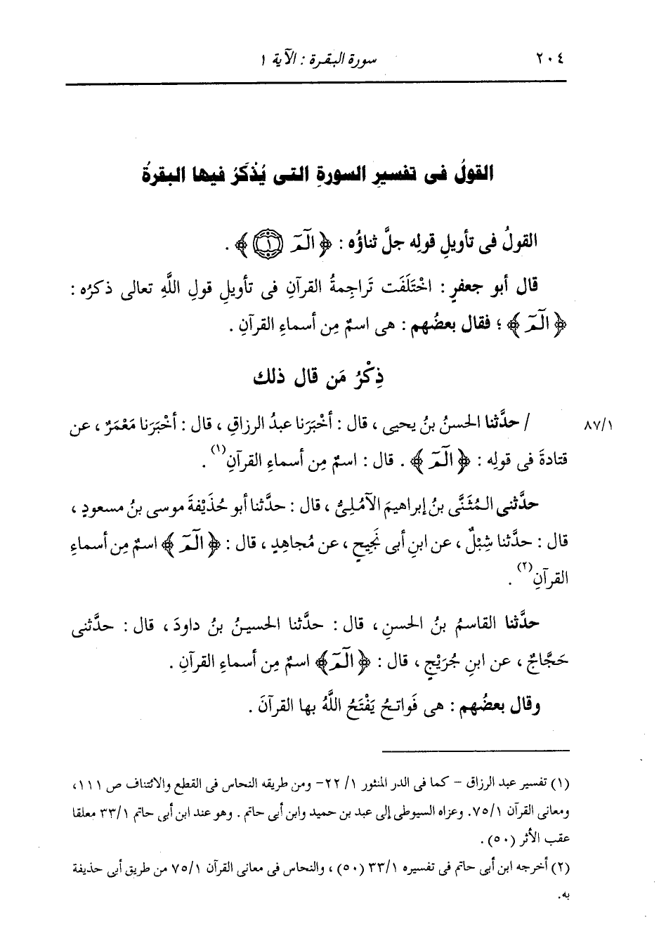 حَدَّثَنَا الْقَاسِمُ بْنُ الْحَسَنِ، قَالَ: حَدَّثَنَا الْحُسَيْنُ بْنُ دَاوُدَ، قَالَ: حَدَّثَنِي حَجَّاجٌ، عَنِ ابْنِ جُرَيْجٍ، قَالَ: " {§الم} [البقرة: 1] اسْمٌ مِنْ أَسْمَاءِ الْقُرْآنِ " وَقَالَ بَعْضُهُمْ: هُوَ فَوَاتِحُ يَفْتَحُ اللَّهُ بِهَا الْقُرْآنَ