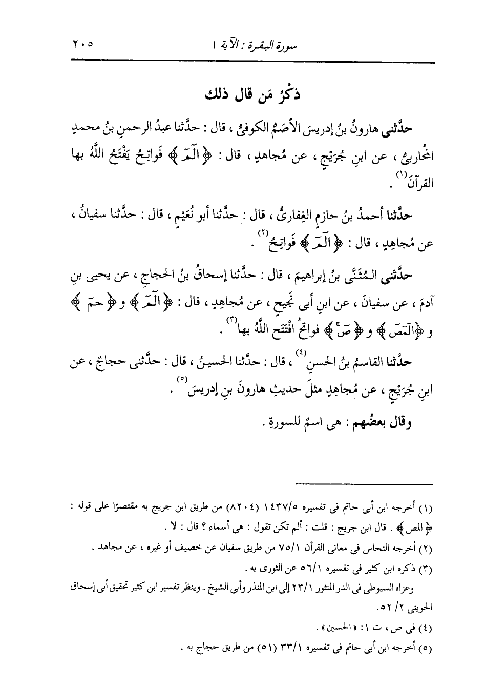 حَدَّثَنِي الْمُثَنَّى بْنُ إِبْرَاهِيمَ، قَالَ: حَدَّثَنَا إِسْحَاقُ بْنُ الْحَجَّاجِ، عَنْ يَحْيَى بْنِ آدَمَ، عَنْ سُفْيَانَ، عَنِ ابْنِ أَبِي نَجِيحٍ، عَنْ مُجَاهِدٍ قَالَ: " {§الم} [البقرة: 1] وَ {حم} [غافر: 1] وَ {المص} [الأعراف: 1] وَ {ص} [ص: 1] فَوَاتِحُ افْتَتَحَ اللَّهُ بِهَا " حَدَّثَنَا الْقَاسِمُ بْنُ الْحَسَنِ، قَالَ: حَدَّثَنَا الْحُسَيْنُ، قَالَ: حَدَّثَنِي حَجَّاجٌ، عَنِ ابْنِ جُرَيْجٍ، عَنْ مُجَاهِدٍ مِثْلَ حَدِيثِ هَارُونَ بْنِ إِدْرِيسَ وَقَالَ بَعْضُهُمْ: هُوَ اسْمٌ لِلسُّورَةِ