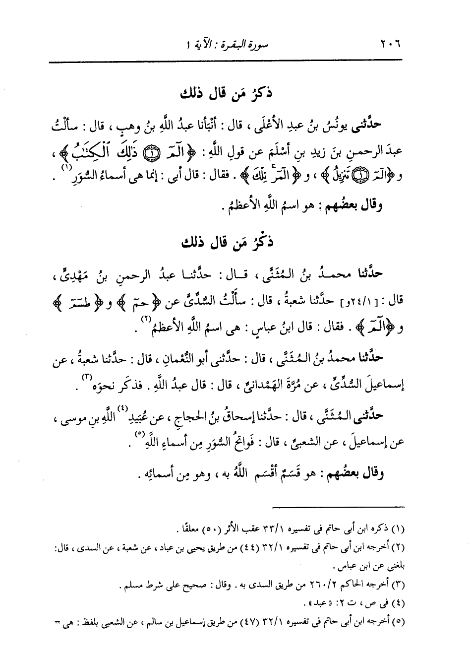 ذِكْرُ مَنْ قَالَ ذَلِكَ حَدَّثَنِي يُونُسُ بْنُ عَبْدِ الْأَعْلَى، قَالَ: أَنْبَأَنَا عَبْدُ اللَّهِ بْنُ وَهْبٍ، قَالَ: سَأَلْتُ عَبْدَ الرَّحْمَنِ بْنِ زَيْدِ بْنِ أَسْلَمَ، عَنْ قَوْلِ اللَّهِ: " {§الم ذَلِكَ الْكِتَابُ} [البقرة: 2] وَ {الم تَنْزِيلُ} [السجدة: 1] وَ {المر تِلْكَ} [الرعد: 1] فَقَالَ: قَالَ أَبِي: إِنَّمَا هِيَ أَسْمَاءُ السُّوَرِ " وَقَالَ بَعْضُهُمْ: هُوَ اسْمُ اللَّهِ الْأَعْظَمُ