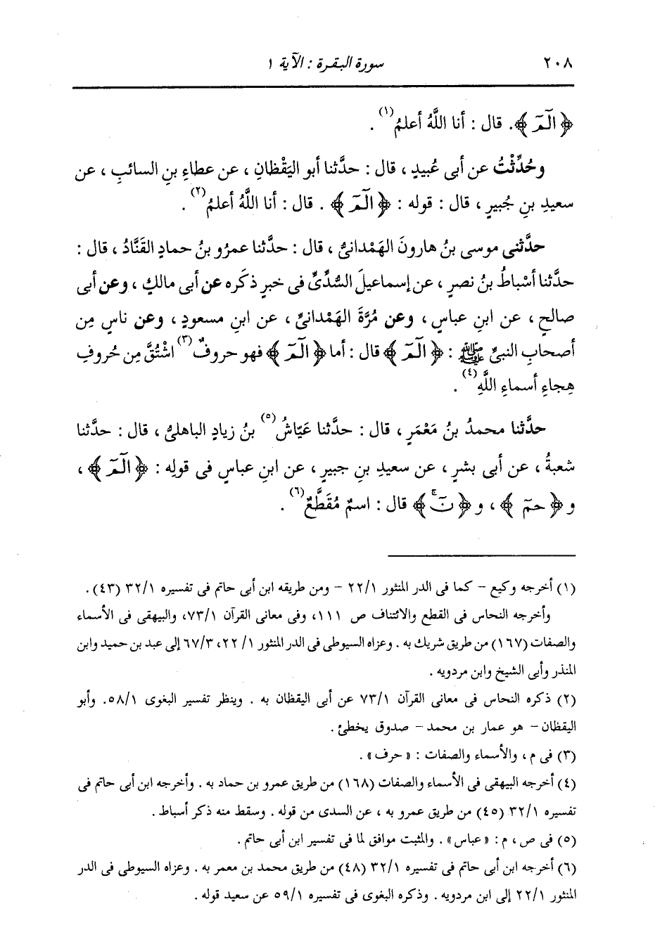 حَدَّثَنِي مُوسَى بْنُ هَارُونَ الْهَمْدَانِيُّ، قَالَ: حَدَّثَنَا عَمْرُو بْنُ حَمَّادٍ الْقَنَّادُ، قَالَ: حَدَّثَنَا أَسْبَاطُ بْنُ نَصْرٍ، عَنْ إِسْمَاعِيلَ السُّدِّيِّ، فِي خَبَرٍ ذَكَرَهُ عَنْ أَبِي مَالِكٍ، وَعَنْ أَبِي صَالِحٍ، عَنِ ابْنِ عَبَّاسٍ، وَعَنْ مُرَّةَ الْهَمْدَانِيِّ، عَنِ ابْنِ مَسْعُودٍ، وَعَنْ نَاسٍ، مِنْ أَصْحَابِ النَّبِيِّ صَلَّى اللهُ عَلَيْهِ وَسَلَّمَ: " {§الم} [البقرة: 1] قَالَ: أَمَّا: {الم} [البقرة: 1] فَهُوَ حَرْفٌ اشْتُقَّ مِنْ حُرُوفِ هِجَاءِ أَسْمَاءِ اللَّهِ جَلَّ ثَنَاؤُهُ "
