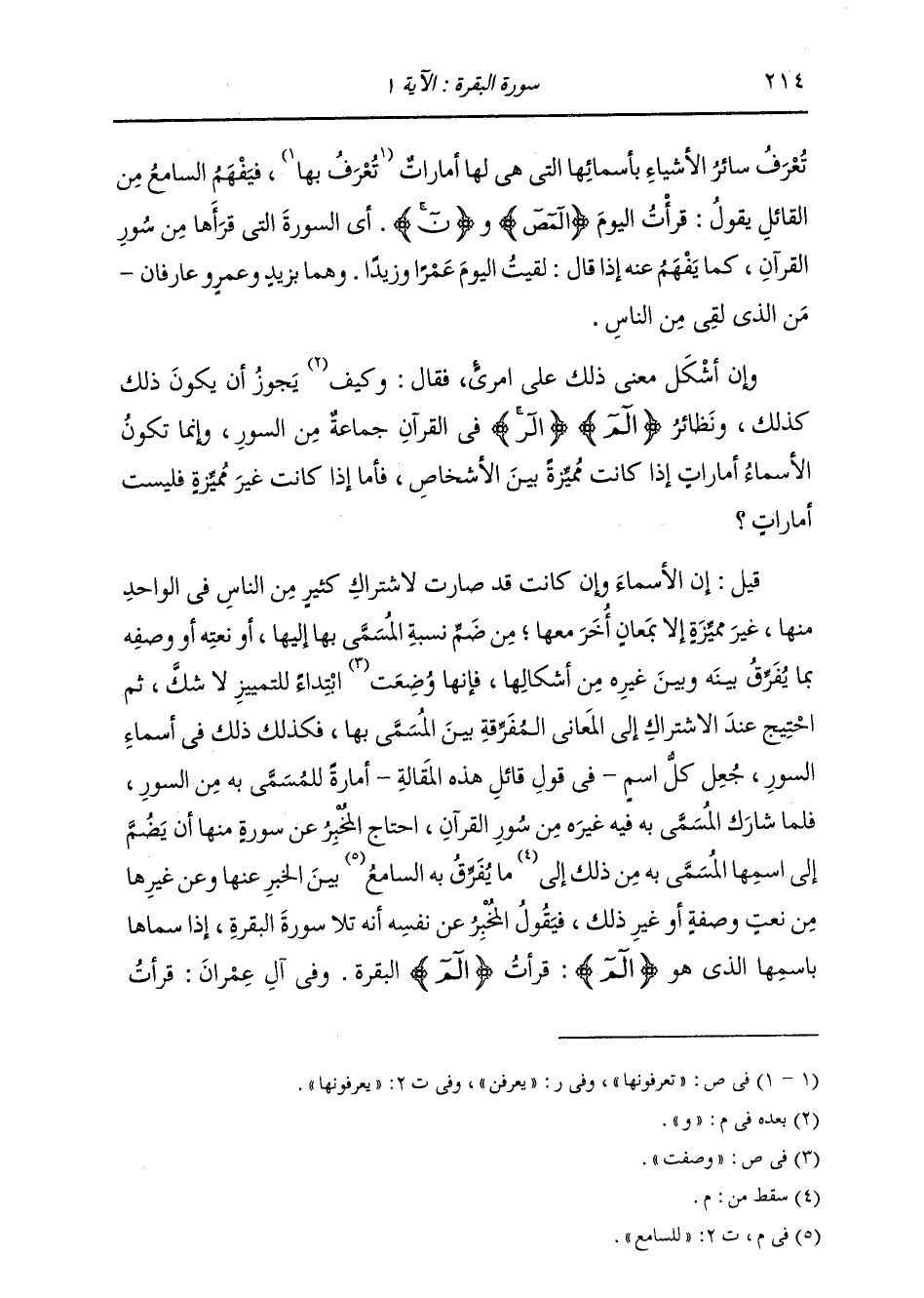تُعْرَفُ سَائِرُ الْأَشْيَاءِ بِأَسْمَائِهَا الَّتِي هِيَ لَهَا أَمَارَاتٌ تُعْرَفُ بِهَا، فَيَفْهَمُ السَّامِعُ مِنَ الْقَائِلِ، يَقُولُ: قَرَأْتُ الْيَوْمَ المص وَن أَيِ السُّورَةَ الَّتِي قَرَأَهَا مِنْ سُوَرِ الْقُرْآنِ، كَمَا يَفْهَمُ عَنْهُ إِذَا قَالَ: لَقِيتُ الْيَوْمَ عَمْرًا وَزَيْدًا، وَهُمَا بِزَيْدَ وَعَمْرٍو عَارِفَانِ مَنِ الَّذِي لَقِيَ مِنَ النَّاسِ. وَإِنْ أَشْكَلَ مَعْنَى ذَلِكَ عَلَى امْرِئٍ فَقَالَ: وَكَيْفَ يَجُوزُ أَنْ يَكُونَ ذَلِكَ كَذَلِكَ وَنَظَائِرُ {الم} [البقرة: 1] {المر} [الرعد: 1] فِي الْقُرْآنِ جَمَاعَةٌ مِنَ السُّوَرِ؟ وَإِنَّمَا تَكُونُ الْأَسْمَاءُ أَمَارَاتٍ، إِذَا كَانَتْ مُمَيِّزَةً بَيْنَ الْأَشْخَاصِ، فَأَمَّا إِذَا كَانَتْ غَيْرَ مُمَيِّزَةٍ فَلَيْسَتْ أَمَارَاتٍ. قِيلَ: إِنَّ الْأَسْمَاءَ وَإِنْ كَانَتْ قَدْ صَارَتْ لِاشْتِرَاكِ كَثِيرٍ مِنَ النَّاسِ فِي الْوَاحِدِ مِنْهَا غَيْرَ مُمَيِّزَةٍ إِلَّا بِمَعَانٍ أُخَرَ مَعَهَا مِنْ ضَمِّ نِسْبَةِ الْمُسَمَّى بِهَا إِلَيْهَا أَوْ نَعْتِهِ أَوْ صِفَتِهِ بِمَا يُفَرِّقُ بَيْنَهُ وَبَيْنَ غَيْرِهِ مِنْ أَشْكَالِهَا، فَإِنَّهَا وُضِعَتْ ابْتِدَاءً لِلتَّمْيِيزِ لَا شَكَّ ثُمَّ احْتِيجَ عِنْدَ الِاشْتِرَاكِ إِلَى الْمَعَانِي الْمُفَرِّقَةِ بَيْنَ الْمُسَمَّى بِهَا. فَكَذَلِكَ ذَلِكَ فِي أَسْمَاءِ السُّوَرِ، جُعِلَ كُلُّ اسْمٍ فِي قَوْلِ قَائِلِ هَذِهِ الْمَقَالَةِ أَمَارَةً لِلْمُسَمَّى بِهِ مِنَ السُّوَرِ فَلَمَّا شَارَكَ الْمُسَمَّى بِهِ فِيهِ غَيْرَهُ مِنْ سُوَرِ الْقُرْآنِ احْتَاجَ الْمُخْبِرُ عَنْ سُورَةٍ مِنْهَا أَنْ يَضُمَّ إِلَى اسْمِهَا الْمُسَمَّى بِهِ مِنْ ذَلِكَ مَا يُفَرِّقُ بِهِ لِلسَّامِعِ بَيْنَ الْخَبَرِ عَنْهَا وَعَنْ غَيْرِهَا مِنْ نَعْتٍ وَصِفَةٍ أَوْ غَيْرِ ذَلِكَ، فَيَقُولُ الْمُخْبِرُ عَنْ نَفْسِهِ إِنَّهُ تَلَا سُورَةَ الْبَقَرَةِ إِذَا سَمَّاهَا بِاسْمِهَا الَّذِي هُوَ {الم} [البقرة: 1] قَرَأْتُ الم الْبَقَرَةَ، وَفِي آلِ عِمْرَانَ: قَرَأْتُ