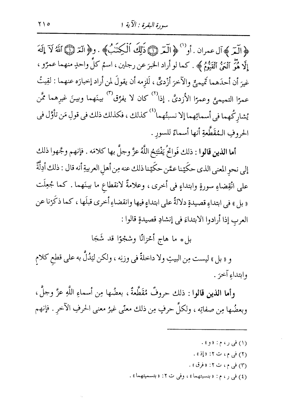 الم آلِ عِمْرَانَ، وَالم ذَلِكَ الْكِتَابُ وَالم اللَّهُ لَا إِلَهُ إِلَّا هُوَ الْحَيُّ الْقَيُّومُ. كَمَا لَوْ أَرَادَ الْخَبَرَ عَنْ رَجُلَيْنِ اسْمُ كُلِّ وَاحِدٍ مِنْهُمَا عَمْرٌو، غَيْرَ أَنَّ أَحَدَهُمَا تَمِيمِيٌّ وَالْآخَرُ أَزْدِيٌّ، لَلَزِمَهُ أَنْ يَقُولَ لِمَنْ أَرَادَ إِخْبَارَهُ عَنْهُمَا: لَقِيتُ عَمْرًا التَّمِيمِيَّ وَعَمْرًا الْأَزْدِيَّ، إِذْ كَانَ لَا فَرْقَ بَيْنَهُمَا وَبَيْنَ غَيْرِهِمَا مِمَّنْ يُشَارِكُهُمَا فِي أَسْمَائِهِمَا إِلَّا بِنَسْبَتِهِمَا كَذَلِكَ، فَكَذَلِكَ ذَلِكَ فِي قَوْلِ مَنْ تَأَوَّلَ فِي الْحُرُوفِ الْمُقَطَّعَةِ أَنَّهَا أَسْمَاءُ لِلسُّوَرِ. وَأَمَّا الَّذِينَ قَالُوا: ذَلِكَ فَوَاتِحُ يَفْتَتِحُ اللَّهُ عَزَّ وَجَلَّ بِهَا كَلَامَهُ، فَإِنَّهُمْ وَجَّهُوا ذَلِكَ إِلَى نَحْوِ الْمَعْنَى الَّذِي حَكَيْنَاهُ عَمَّنْ حَكَيْنَا عَنْهُ مِنْ أَهْلِ الْعَرَبِيَّةِ أَنَّهُ قَالَ: ذَلِكَ أَدِلَّةٌ عَلَى انْقِضَاءِ سُورَةٍ وَابْتِدَاءٍ فِي أُخْرَى وَعَلَامَةٌ لِانْقِطَاعِ مَا بَيْنَهُمَا، كَمَا جُعِلَتْ بَلْ فِي ابْتِدَاءِ قَصِيدَةٍ دَلَالَةً عَلَى ابْتِدَاءٍ فِيهَا وَانْقِضَاءِ أُخْرَى قَبْلَهَا كَمَا ذَكَرْنَا عَنِ الْعَرَبِ إِذَا أَرَادُوا الِابْتِدَاءَ فِي إِنْشَادِ قَصِيدَةٍ، قَالُوا: بَلْ،