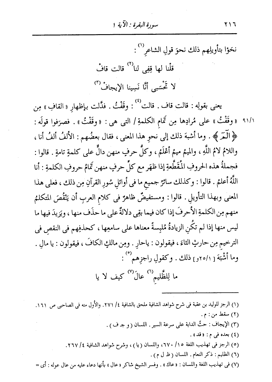 يَعْنِي بِقَوْلِهِ: قَالَتْ قَافْ: قَالَتْ قَدْ وَقَفْتُ. فَدَلَّتْ بِإِظْهَارِ الْقَافِ مِنْ وَقَفَتْ عَلَى مُرَادِهَا مِنْ تَمَامِ الْكَلِمَةِ الَّتِي هِيَ وَقَفَتْ، فَصَرَفُوا قَوْلَهُ: {الم} [البقرة: 1] وَمَا أَشْبَهَ ذَلِكَ إِلَى نَحْوِ هَذَا الْمَعْنَى، فَقَالَ بَعْضُهُمُ: الْأَلِفُ أَلِفُ أَنَا، وَاللَّامُ لَامُ اللَّهِ، وَالْمِيمُ مِيمُ أَعْلَمُ، وَكُلُّ حَرْفٍ مِنْهَا دَالٌّ عَلَى كَلِمَةٍ تَامَّةٍ. قَالُوا: فَجُمْلَةُ هَذِهِ الْحُرُوفِ الْمُقَطَّعَةِ إِذَا ظَهَرَ مَعَ كُلِّ حَرْفٍ مِنْهُنَّ تَمَامُ حُرُوفِ الْكَلِمَةِ أَنَا اللَّهُ أَعْلَمُ. قَالُوا: وَكَذَلِكَ سَائِرُ جَمِيعِ مَا فِي أَوَائِلِ سُوَرِ الْقُرْآنِ مِنْ ذَلِكَ، فَعَلَى هَذَا الْمَعْنَى وَبِهَذَا التَّأْوِيلِ. قَالُوا: وَمُسْتَفِيضٌ ظَاهِرٌ فِي كَلَامِ الْعَرَبِ أَنْ يُنْقِصَ الْمُتَكَلِّمُ مِنْهُمْ مِنَ الْكَلِمَةِ الْأَحْرُفَ إِذَا كَانَ فِيمَا بَقِيَ دَلَالَةٌ عَلَى مَا حَذَفَ مِنْهَا، وَيَزِيدُ فِيهَا مَا لَيْسَ مِنْهَا إِذَا لَمْ تَكُنِ الزِّيَادَةُ مُلَبِّسَةً مَعْنَاهَا عَلَى سَامِعِهَا كَحَذْفِهِمْ فِي النَّقْصِ فِي التَّرْخِيمِ مِنْ حَارِثٍ الثَّاءَ فَيَقُولُونَ: يَا حَارِّ، وَمِنْ مَالِكٍ الْكَافَ فَيَقُولُونَ: يَا مَالِّ، وَمَا أَشْبَهَ ذَلِكَ. وَكَقَوْلِ رَاجِزِهِمْ: