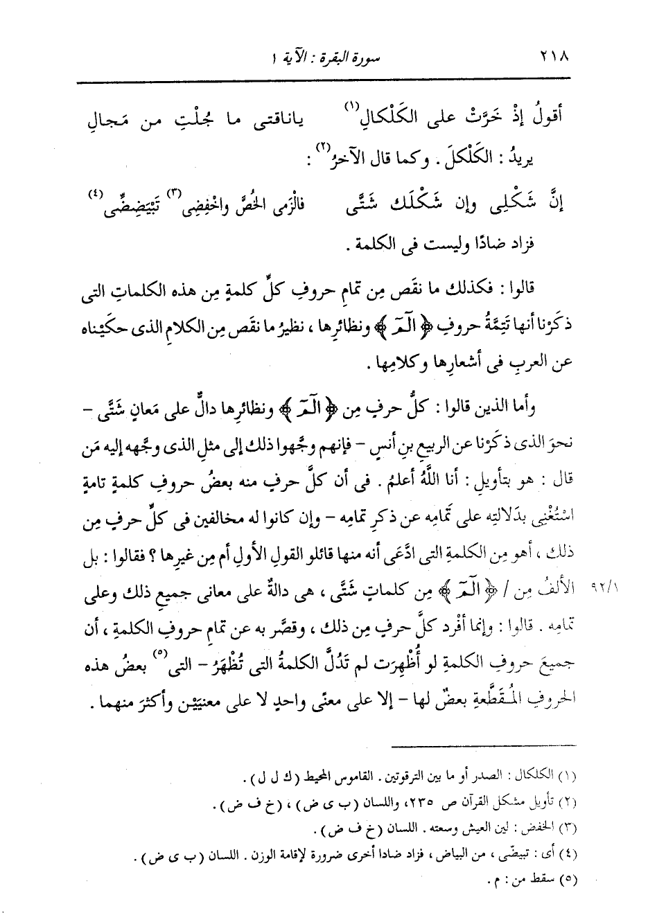 فَالْزَمِي الْخُصَّ وَاخْفِضِي تَبْيَضِضِّي فَزَادَ ضَادًا وَلَيْسَتْ فِي الْكَلِمَةِ. قَالُوا: فَكَذَلِكَ مَا نَقَصَ مِنْ تَمَامِ حُرُوفِ كُلِّ كَلِمَةٍ مِنْ هَذِهِ الْكَلِمَاتِ الَّتِي ذَكَرْنَا أَنَّهَا تَتِمَّةُ حُرُوفِ {الم} [البقرة: 1] وَنَظَائِرِهَا، نَظِيرُ مَا نَقَصَ مِنَ الْكَلَامِ الَّذِي حَكَيْنَاهُ عَنِ الْعَرَبِ فِي أَشْعَارِهَا وَكَلَامِهَا. وَأَمَّا الَّذِينَ قَالُوا: كُلُّ حَرْفٍ مِنْ {الم} [البقرة: 1] وَنَظَائِرِهَا دَالٌّ عَلَى مَعَانٍ شَتَّى نَحْوَ الَّذِي ذَكَرْنَا عَنِ الرَّبِيعِ بْنِ أَنَسٍ، فَإِنَّهُمْ وَجَّهُوا ذَلِكَ إِلَى مِثْلِ الَّذِي وَجَّهَهُ إِلَيْهِ مَنْ قَالَ هُوَ بِتَأْوِيلِ: أَنَا اللَّهُ أَعْلَمُ فِي أَنَّ كُلَّ حَرْفٍ مِنْهُ بَعْضُ حُرُوفِ كَلِمَةٍ تَامَّةٍ اسْتَغْنَى بِدَلَالَتِهِ عَلَى تَمَامِهِ عَنْ ذِكْرِ تَمَامِهِ، وَإِنْ كَانُوا لَهُ مُخَالِفِينَ فِي كُلِّ حَرْفٍ مِنْ ذَلِكَ، أَهُوَ مِنَ الْكَلِمَةَ الَّتِي ادَّعَى أَنَّهُ مِنْهَا قَائِلُو الْقَوْلِ الْأَوَّلِ أَمْ مِنْ غَيْرِهَا؟ فَقَالُوا: بَلِ الْأَلِفُ مِنْ {الم} [البقرة: 1] مِنْ كَلِمَاتٍ شَتَّى هِيَ دَالَّةٌ عَلَى مَعَانِي جَمِيعِ ذَلِكَ وَعَلَى تَمَامِهِ. قَالُوا: وَإِنَّمَا أُفْرِدَ كُلُّ حَرْفٍ مِنْ ذَلِكَ وَقُصِرَ بِهِ عَنْ تَمَامِ حُرُوفِ الْكَلِمَةِ أَنَّ جَمِيعَ حُرُوفِ الْكَلِمَةِ لَوْ أُظْهِرَتْ لَمْ تَدُلَّ الْكَلِمَةُ الَّتِي تَظْهَرُ بَعْضُ هَذِهِ الْحُرُوفِ الْمُقَطَّعَةِ بَعْضٌ لَهَا، إِلَّا عَلَى مَعْنَى وَاحِدٍ لَا عَلَى مَعْنَيَيْنِ وَأَكْثَرَ مِنْهُمَا.