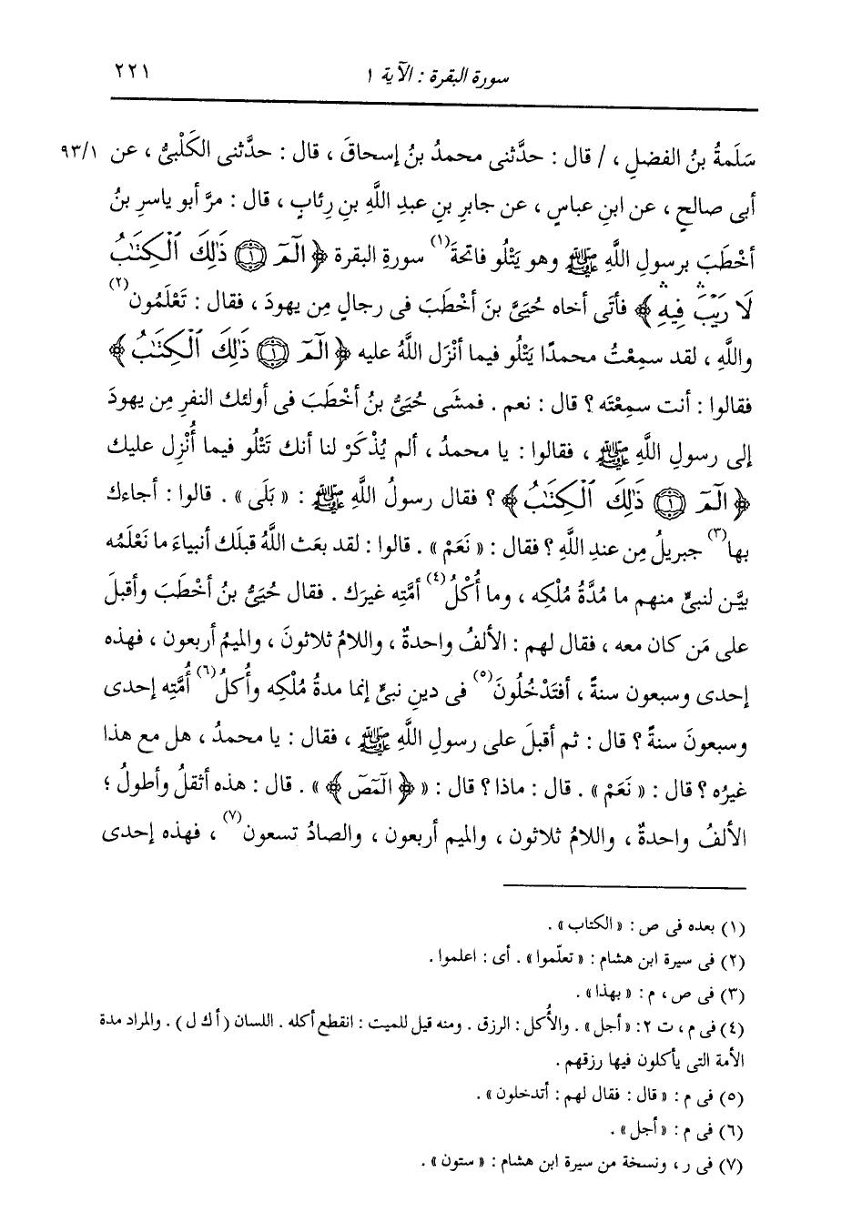 سَلَمَةُ بْنُ الْفَضْلِ، قَالَ: حَدَّثَنِي مُحَمَّدُ بْنُ إِسْحَاقَ، قَالَ: حَدَّثَنِي الْكَلْبِيُّ، عَنْ أَبِي صَالِحٍ، عَنِ ابْنِ عَبَّاسٍ، عَنْ جَابِرِ بْنِ عَبْدِ اللَّهِ بْنِ رِئَابٍ، قَالَ: مَرَّ أَبُو يَاسِرِ بْنُ أَخْطَبَ بِرَسُولِ اللَّهِ صَلَّى اللهُ عَلَيْهِ وَسَلَّمَ وَهُوَ يَتْلُو فَاتِحَةَ سُورَةِ الْبَقَرَةِ: {الم ذَلِكَ الْكِتَابُ لَا رَيْبَ فِيهِ} [البقرة: 2] فَأَتَى أَخَاهُ حُيَيَّ بْنَ أَخْطَبَ فِي رِجَالٍ مِنْ يَهُودَ فَقَالَ: تَعْلَمُونَ وَاللَّهِ لَقَدْ سَمِعْتُ مُحَمَّدًا يَتْلُو فِيمَا أَنْزَلَ اللَّهُ عَزَّ وَجَلَّ عَلَيْهِ: {الم ذَلِكَ الْكِتَابُ} [البقرة: 1] فَقَالُوا: أَنْتَ سَمِعْتَهُ؟ قَالَ: نَعَمْ فَمَشَى حُيَيُّ بْنُ أَخْطَبَ فِي أُولَئِكَ النَّفْرِ مِنْ يَهُودَ إِلَى رَسُولِ اللَّهِ صَلَّى اللهُ عَلَيْهِ وَسَلَّمَ، فَقَالُوا: يَا مُحَمَّدُ أَلَمْ يُذْكَرْ لَنَا أَنَّكَ تَتْلُو فِيمَا أُنْزِلَ عَلَيْكَ: {§الم ذَلِكَ الْكِتَابُ} [البقرة: 1] فَقَالَ رَسُولُ اللَّهِ صَلَّى اللهُ عَلَيْهِ وَسَلَّمَ: «بَلَى» فَقَالُوا: أَجَاءَكَ بِهَذَا جِبْرِيلُ مِنْ عِنْدِ اللَّهِ؟ قَالَ: «نَعَمْ» قَالُوا: لَقَدْ بَعَثَ اللَّهُ جَلَّ ثَنَاؤُهُ قَبْلَكَ أَنْبِيَاءَ مَا نَعْلَمُهُ بَيَّنَ لِنَبِيٍّ مِنْهُمْ مَا مُدَّةُ مُلْكِهِ وَمَا أَجَلُ أُمَّتِهِ غَيْرَكَ فَقَالَ حُيَيُّ بْنُ أَخْطَبَ: وَأَقْبَلَ عَلَى مَنْ كَانَ مَعَهُ، فَقَالَ لَهُمُ: الْأَلِفُ وَاحِدَةٌ، وَاللَّامُ ثَلَاثُونَ، وَالْمِيمُ أَرْبَعُونَ، فَهَذِهِ إِحْدَى وَسَبْعُونَ سَنَةً، قَالَ: فَقَالَ لَهُمْ: أَتَدْخُلُونَ فِي دِينِ نَبِيٍّ إِنَّمَا مُدَّةُ مُلْكِهِ وَأَجَلُ أُمَّتِهِ إِحْدَى وَسَبْعُونَ سَنَةً؟ قَالَ: ثُمَّ أَقْبَلَ عَلَى رَسُولِ اللَّهِ صَلَّى اللهُ عَلَيْهِ وَسَلَّمَ، فَقَالَ: يَا مُحَمَّدُ هَلْ مَعَ هَذَا غَيْرُهُ؟ قَالَ: «نَعَمْ» قَالَ: مَاذَا؟ قَالَ: " {المص} [الأعراف: 1] " قَالَ: هَذِهِ أَثْقَلُ وَأَطْوَلُ: الْأَلِفُ وَاحِدَةٌ، وَاللَّامُ ثَلَاثُونَ، وَالْمِيمُ أَرْبَعُونَ، وَالصَّادُ تِسْعَوْنَ. فَهَذِهِ مِائَةٌ وَإِحْدَى