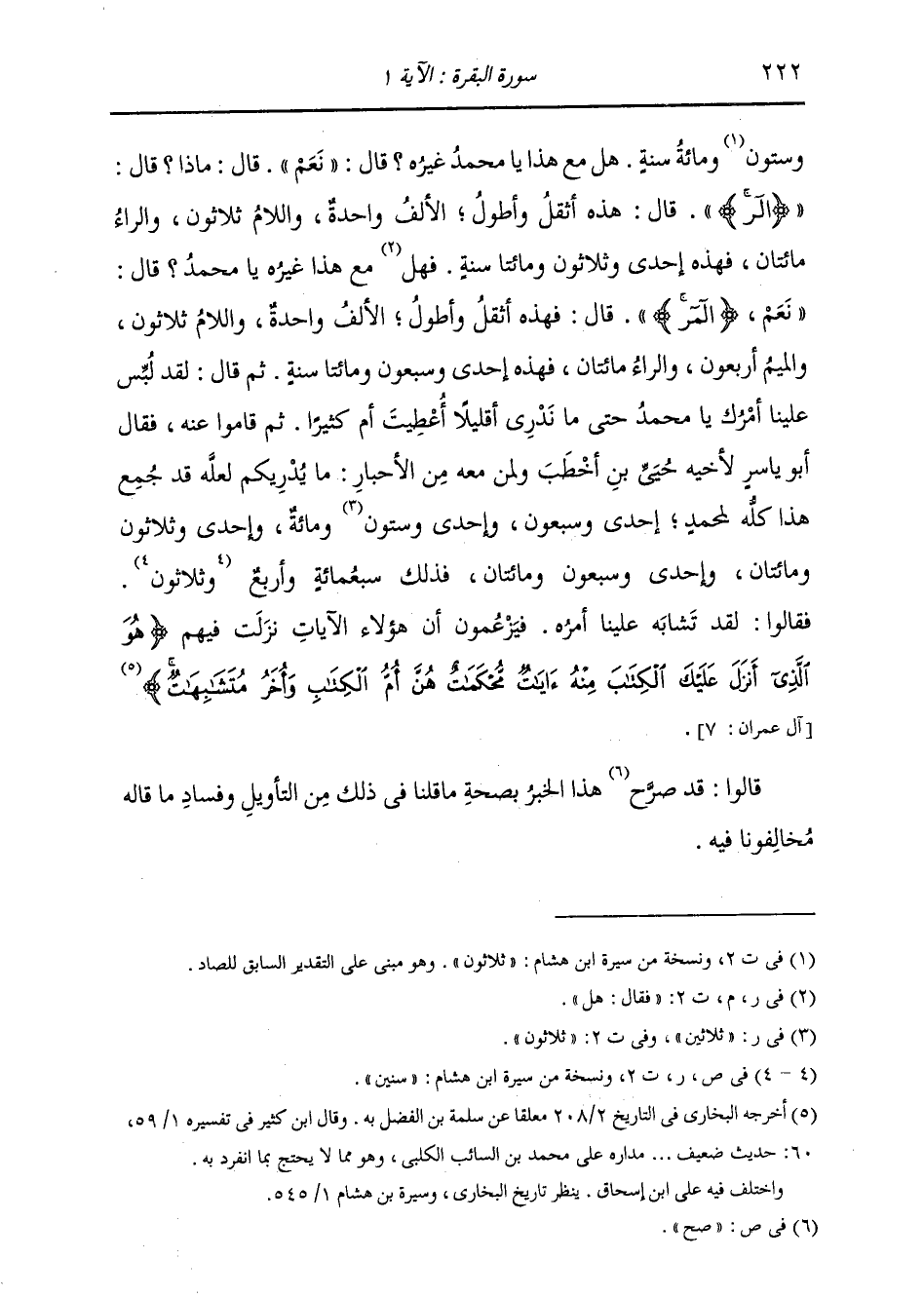 وَسِتُّونَ سَنَةً؛ هَلْ مَعَ هَذَا يَا مُحَمَّدُ غَيْرُهُ؟ قَالَ: «نَعَمْ» قَالَ: مَاذَا؟ قَالَ: " {الر} [يونس: 1] " قَالَ: هَذِهِ أَثْقَلُ وَأَطْوَلُ الْأَلِفُ وَاحِدَةٌ، وَاللَّامُ ثَلَاثُونَ، وَالرَّاءُ مِائَتَانِ، فَهَذِهِ إِحْدَى وَثَلَاثُونَ وَمِائَتَا سَنَةٍ؛ فَقَالَ: هَلْ مَعَ هَذَا غَيْرُهُ يَا مُحَمَّدُ؟ قَالَ: " نَعَمْ، {المر} [الرعد: 1] " قَالَ: فَهَذِهِ أَثْقَلُ وَأَطْوَلُ: الْأَلِفُ وَاحِدَةٌ وَاللَّامُ ثَلَاثُونَ، وَالْمِيمُ أَرْبَعُونَ، وَالرَّاءُ مِائَتَانِ، فَهَذِهِ إِحْدَى وَسَبْعُونَ وَمِائَتَا سَنَةٍ. ثُمَّ قَالَ: لَقَدْ لُبِّسَ عَلَيْنَا أَمْرُكَ يَا مُحَمَّدُ، حَتَّى مَا نَدْرِي أَقَلِيلًا أُعْطِيتَ أَمْ كَثِيرًا ثُمَّ قَامُوا عَنْهُ، فَقَالَ أَبُو يَاسِرٍ لِأَخِيهِ حُيَيِّ بْنِ أَخْطَبَ وَلِمَنْ مَعَهُ مِنَ الْأَحْبَارِ: مَا يُدْرِيكُمْ لَعَلَّهُ قَدْ جُمِعَ هَذَا كُلُّهُ لِمُحَمَّدٍ: إِحْدَى وَسَبْعُونَ، وَإِحْدَى وَسِتُّونَ وَمِائَةٌ، وَمِائَتَانِ وَإِحْدَى وَثَلَاثُونَ، وَمِائَتَانِ وَإِحْدَى وَسَبْعُونَ، فَذَلِكَ سَبْعمِائَةُ سَنَةٍ وَأَرْبَعٌ وَثَلَاثُونَ، فَقَالُوا: لَقَدْ تَشَابَهَ عَلَيْنَا أَمْرُهُ. وَيَزْعُمُونَ أَنَّ هَؤُلَاءِ الْآيَاتِ نَزَلَتْ فِيهِمْ: {هُوَ الَّذِي أَنْزَلَ عَلَيْكَ الْكِتَابَ مِنْهُ آيَاتٌ مُحْكَمَاتٌ هُنَّ أُمُّ الْكِتَابِ وَأُخَرُ مُتَشَابِهَاتٌ} [آل عمران: 7] فَقَالُوا: قَدْ صَرَّحَ هَذَا الْخَبَرُ بِصِحَّةِ مَا قُلْنَا فِي ذَلِكَ مِنَ التَّأْوِيلِ وَفَسَادِ مَا قَالَهُ مُخَالِفُونَا فِيهِ.