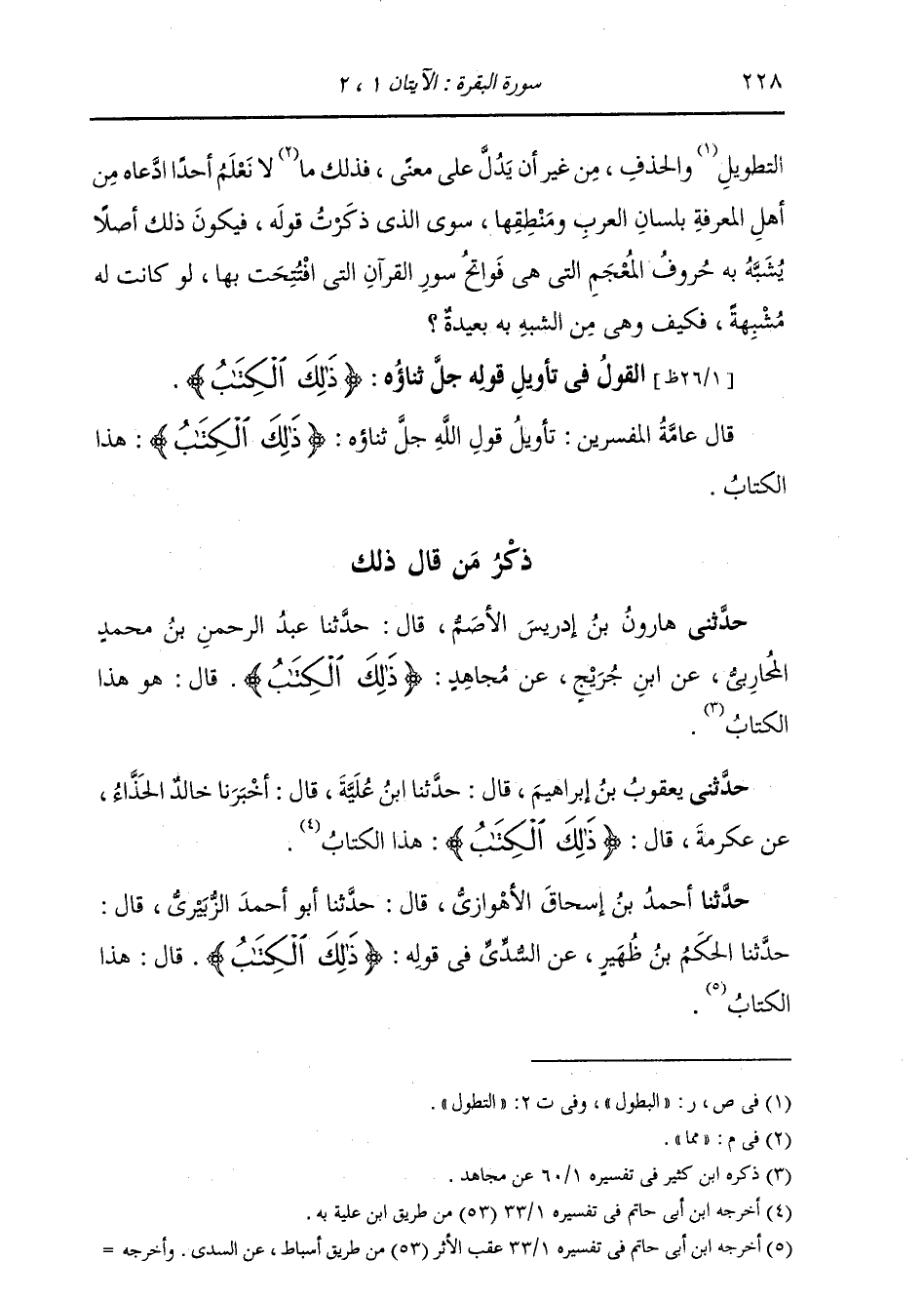 ذِكْرُ مَنْ قَالَ ذَلِكَ حَدَّثَنِي هَارُونُ بْنُ إِدْرِيسَ الْأَصَمُّ الْكُوفِيُّ، قَالَ: حَدَّثَنَا عَبْدُ الرَّحْمَنِ بْنُ مُحَمَّدٍ الْمُحَارِبِيُّ، عَنِ ابْنِ جُرَيْجٍ، عَنْ مُجَاهِدٍ: " {§ذَلِكَ الْكِتَابُ} [البقرة: 2] قَالَ: هُوَ هَذَا الْكِتَابُ "