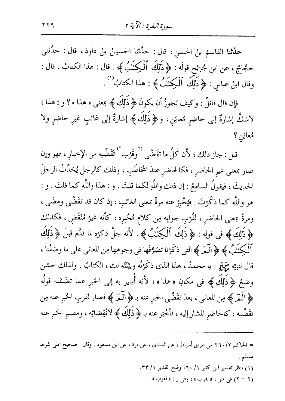 حَدَّثَنَا الْقَاسِمُ بْنُ الْحَسَنِ، قَالَ: حَدَّثَنَا الْحُسَيْنُ بْنُ دَاوُدَ، قَالَ: حَدَّثَنِي حَجَّاجٌ، عَنِ ابْنِ جُرَيْجٍ، قَوْلُهُ: {ذَلِكَ الْكِتَابُ} [البقرة: 2] هَذَا الْكِتَابُ قَالَ: قَالَ ابْنُ عَبَّاسٍ: " {§ذَلِكَ الْكِتَابُ} [البقرة: 2] هَذَا الْكِتَابُ " فَإِنْ قَالَ قَائِلٌ: وَكَيْفَ يَجُوزُ أَنْ يَكُونَ ذَلِكَ بِمَعْنَى هَذَا؟ وَهَذَا لَا شَكَّ إِشَارَةٌ إِلَى حَاضِرٍ مُعَايَنٌ، وَذَلِكَ إِشَارَةٌ إِلَى غَائِبٍ غَيْرِ حَاضِرٍ وَلَا مُعَايَنٍ؟ قِيلَ: جَازَ ذَلِكَ لِأَنَّ كُلَّ مَا تَقَضَّى وَقَرُبَ تَقَضِّيهِ مِنَ الْأَخْبَارِ فَهُوَ وَإِنْ صَارَ بِمَعْنَى غَيْرِ الْحَاضِرِ، فَكَالْحَاضِرِ عِنْدَ الْمُخَاطَبِ؛ وَذَلِكَ كَالرَّجُلِ يُحَدِّثُ الرَّجُلَ الْحَدِيثَ، فَيَقُولُ السَّامِعُ: إِنَّ ذَلِكَ وَاللَّهِ لَكُمَا قُلْتَ، وَهَذَا وَاللَّهِ كَمَا قُلْتَ، وَهُوَ وَاللَّهِ كَمَا ذَكَرْتَ. فَيُخْبِرُ عَنْهُ مَرَّةً بِمَعْنَى الْغَائِبِ إِذْ كَانَ قَدْ تَقَضَّى وَمَضَى، وَمَرَّةً بِمَعْنَى الْحَاضِرِ لِقُرْبِ جَوَابِهِ مِنْ كَلَامِ مُخْبِرِهِ كَأَنَّهُ غَيْرُ مُنْقَضٍ، فَكَذَلِكَ ذَلِكَ فِي قَوْلِهِ: {ذَلِكَ الْكِتَابُ} [البقرة: 2] لِأَنَّهُ جَلَّ ذِكْرُهُ لَمَّا قَدَّمَ قَبْلَ ذَلِكَ الْكِتَابَ {الم} [البقرة: 1] الَّتِي ذَكَرْنَا تَصَرُّفَهَا فِي وُجُوهِهَا مِنَ الْمَعَانِي عَلَى مَا وَصَفْنَا، قَالَ لِنَبِيِّهِ صَلَّى اللهُ عَلَيْهِ وَسَلَّمَ: يَا مُحَمَّدُ هَذَا الَّذِي ذَكَرْتُهُ وَبَيَّنْتُهُ لَكَ الْكِتَابُ. وَلِذَلِكَ حَسُنَ وَضْعُ ذَلِكَ فِي مَكَانِ هَذَا، لِأَنَّهُ أُشِيرَ بِهِ إِلَى الْخَبَرِ عَمَّا تَضَمَّنَهُ قَوْلُهُ: {الم} [البقرة: 1] مِنَ الْمَعَانِي بَعْدَ تَقَضِّي الْخَبَرُ عَنْهُ {الم} [البقرة: 1] ، فَصَارَ لِقُرْبِ الْخَبَرِ عَنْهُ مِنْ تَقَضِّيهِ كَالْحَاضِرِ الْمُشَارِ إِلَيْهِ، فَأُخْبِرَ عَنْهُ بِذَلِكَ لِانْقِضَائِهِ وَمَصِيرِ الْخَبَرِ عَنْهُ