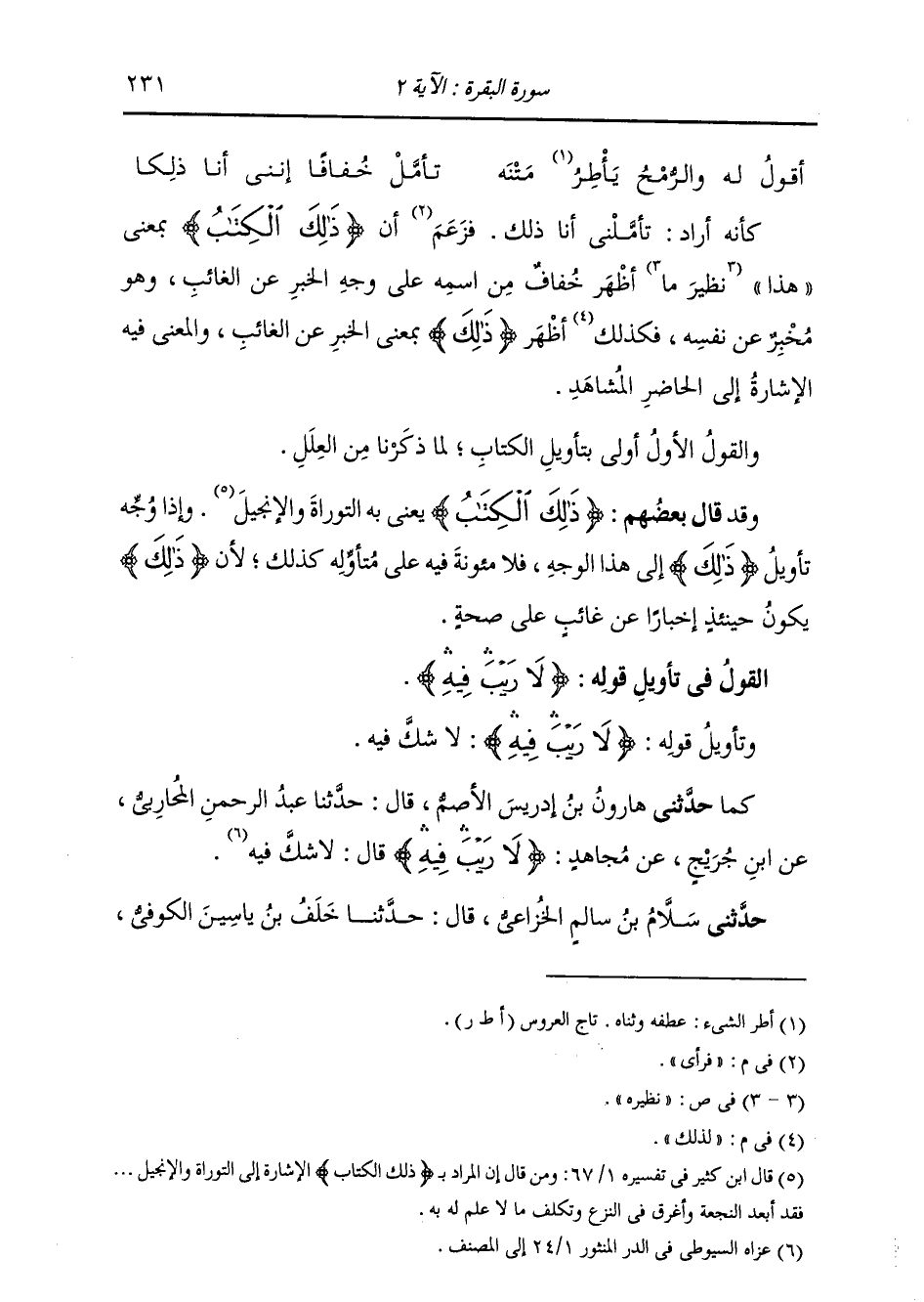 §الْقَوْلُ فِي تَأْوِيلِ قَوْلِهِ تَعَالَى: {لَا رَيْبَ فِيهِ} [البقرة: 2] وَتَأْوِيلُ قَوْلِهِ: {لَا رَيْبَ فِيهِ} [البقرة: 2] لَا شَكَّ فِيهِ،